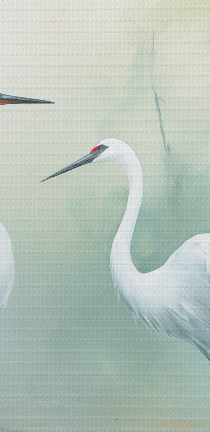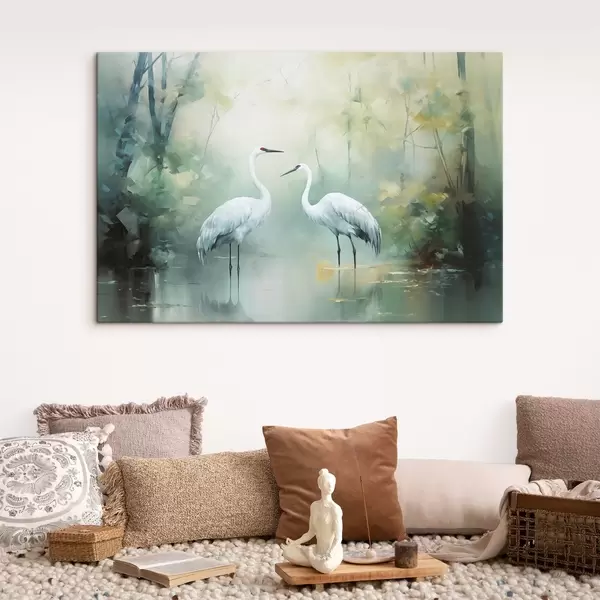 Paveikslas Tvenkinyje stovinčios dvi baltos gervės, apsuptos sodraus žalio miško su švelniu, išsklaidytu apšvietimu Nr s43166