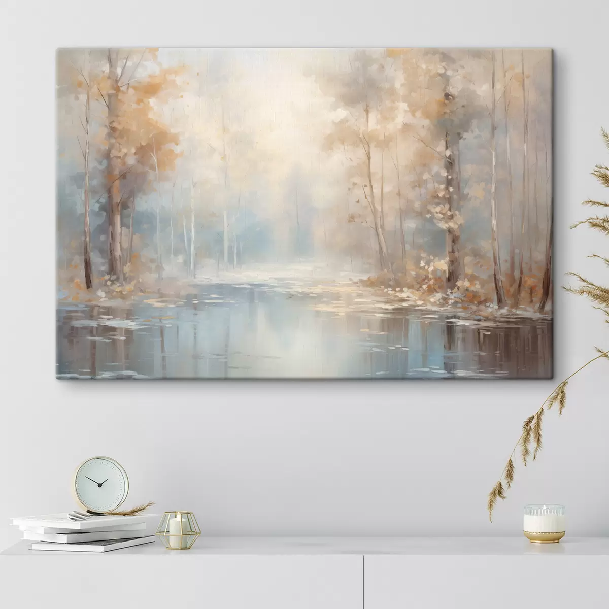 Paveikslas Peizažas tapyba aliejiniais dažais imitacija ramios upės atspindi minkštą šviesą, apsuptas rudens medžių Nr s43167