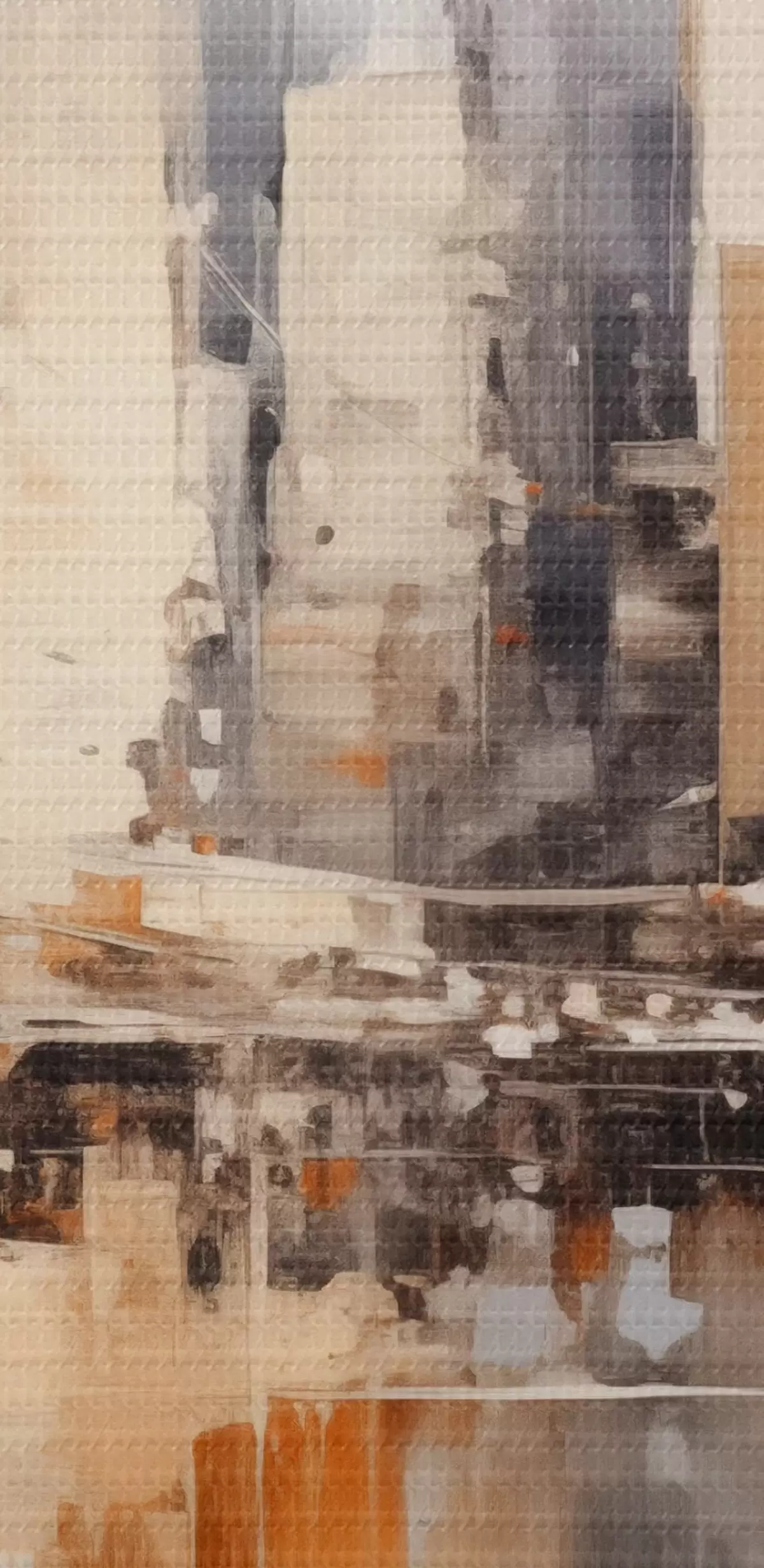 Paveikslas Abstraktus miesto peizažas su aukštais rudos, pilkos ir baltos spalvos pastatais, atsispindinčiais vandenyje Nr s43168