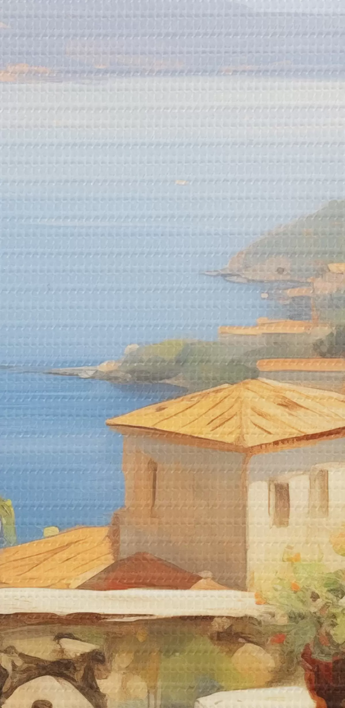 Paveikslas Tapyba aliejiniais dažais balkono su gėlėmis imitacija, su vaizdu į jūrą, namus pakrantėje, saulėtą dieną, mėlynas dangus Nr s43173