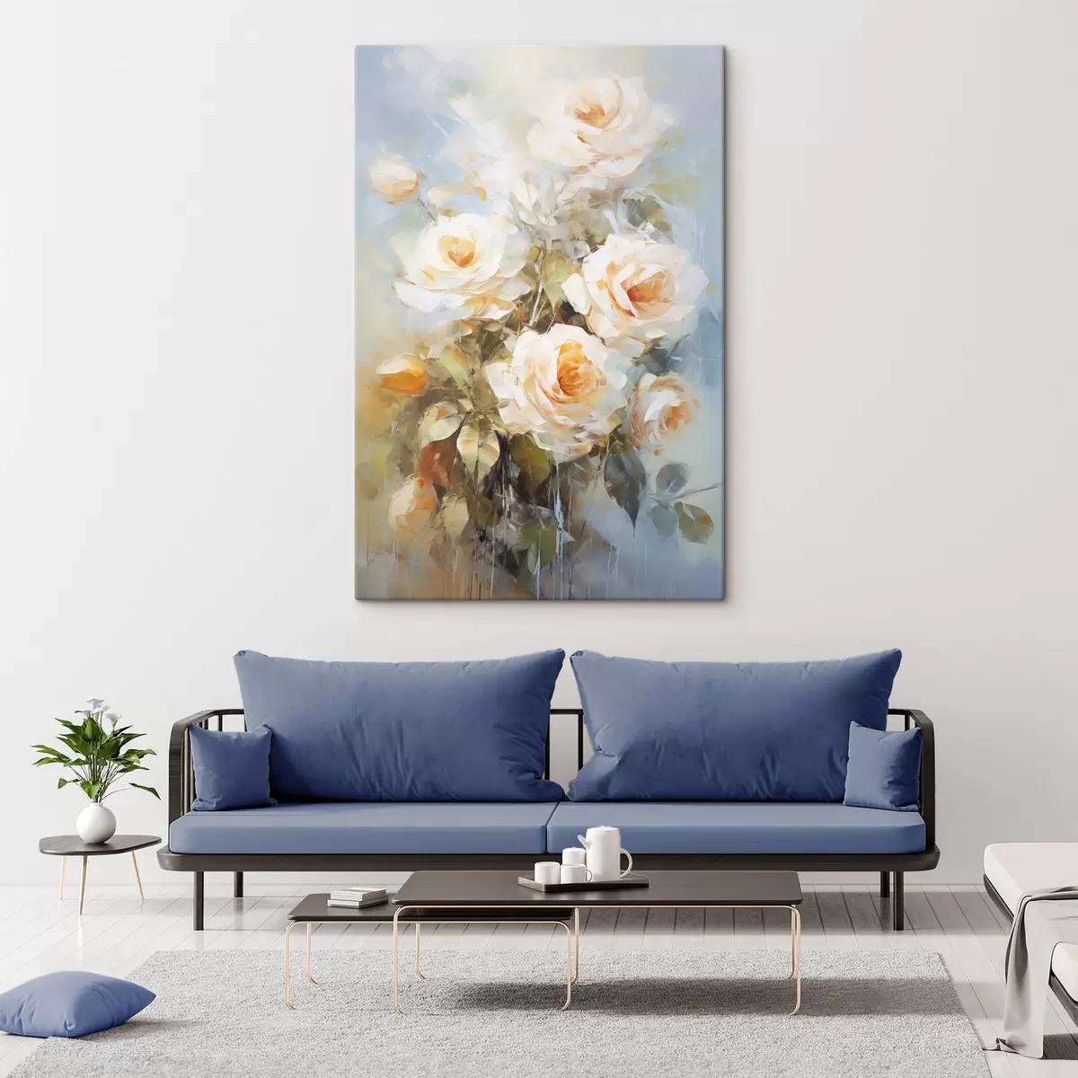 Paveikslas Baltos rožės su oranžine spalva švelniame, šviesiai mėlyname fone, su matomais teptuko potėpiais ir tapybiniu stiliumi Nr s43175