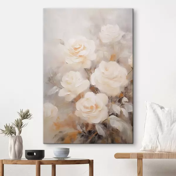 Paveikslas Baltos rožės su švelniais žiedlapiais, prislopintų spalvų ir neryškių formų fone, sukuriančios svajingą efektą Nr s43177