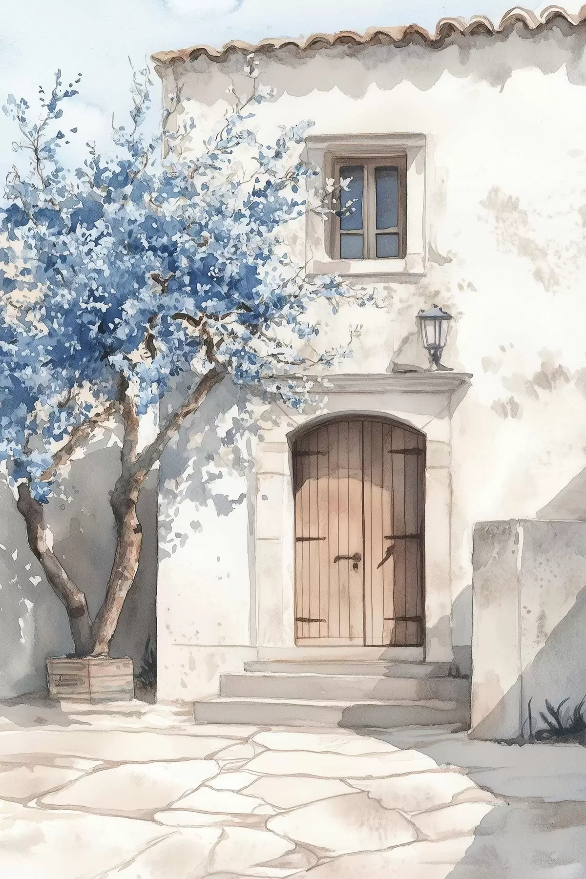Paveikslas Graikų namas su gražiu medžiu, architektūra, akvarelės stilius Nr s43178