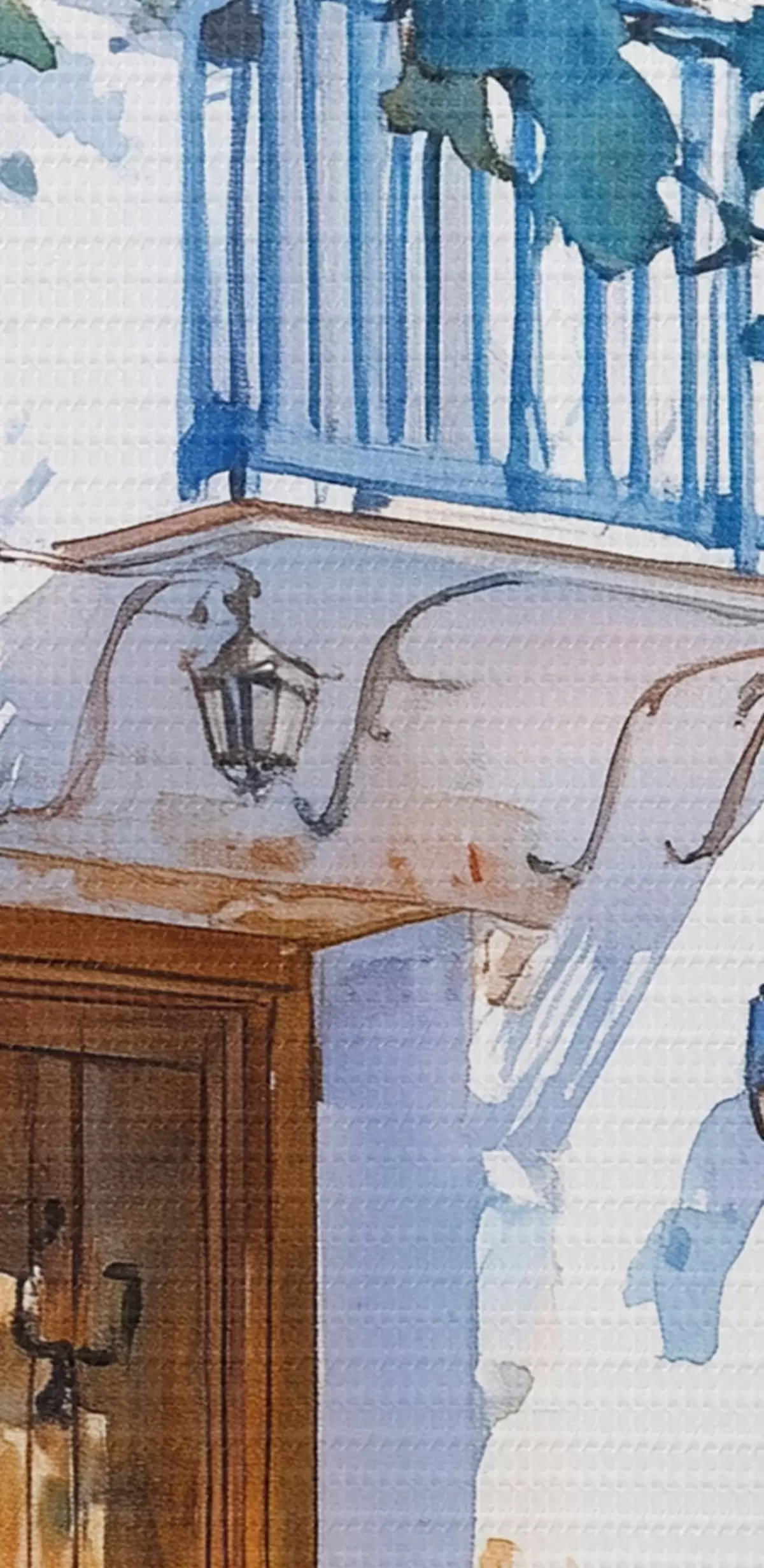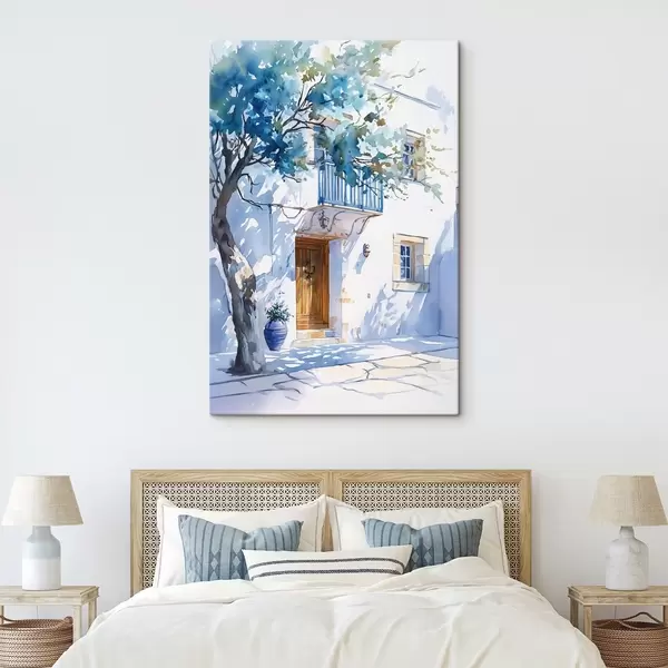 Paveikslas Akvarelės stilius, graikų namas, žydintis medis, architektūra Nr s43182