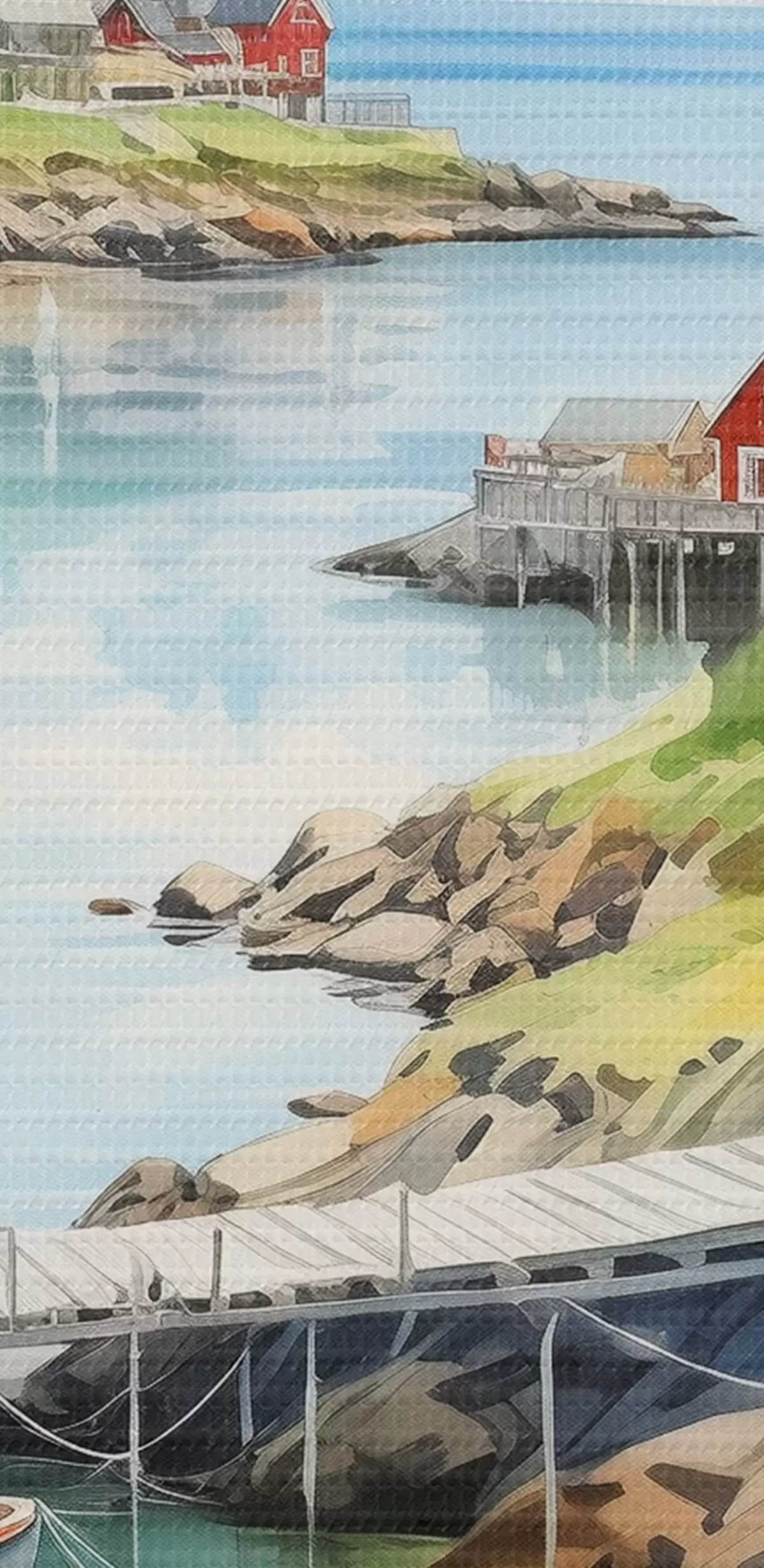 Paveikslas Lofoteno salų vasaros kraštovaizdis, raudoni namai, kalnai, valtys Nr s43187