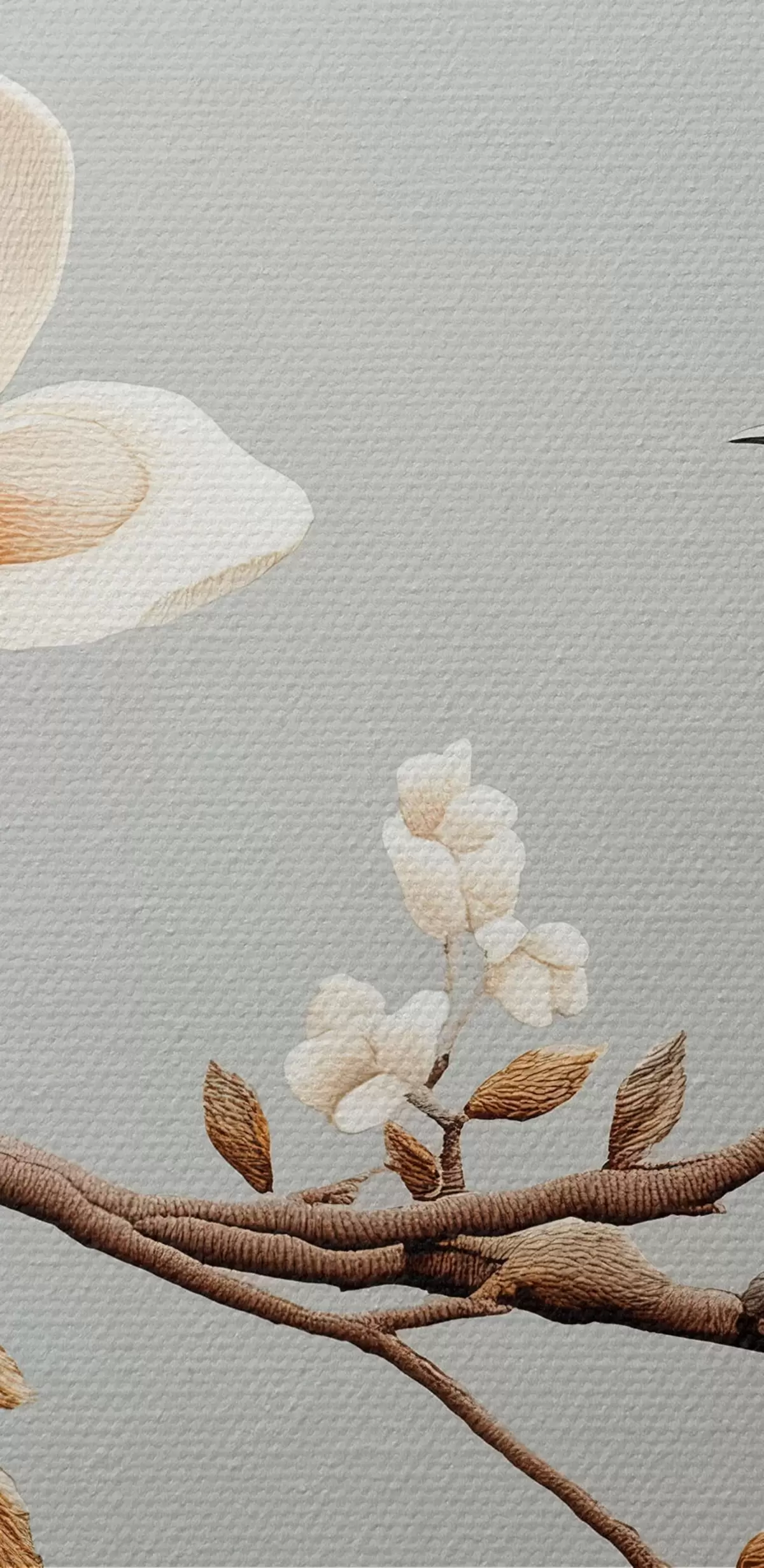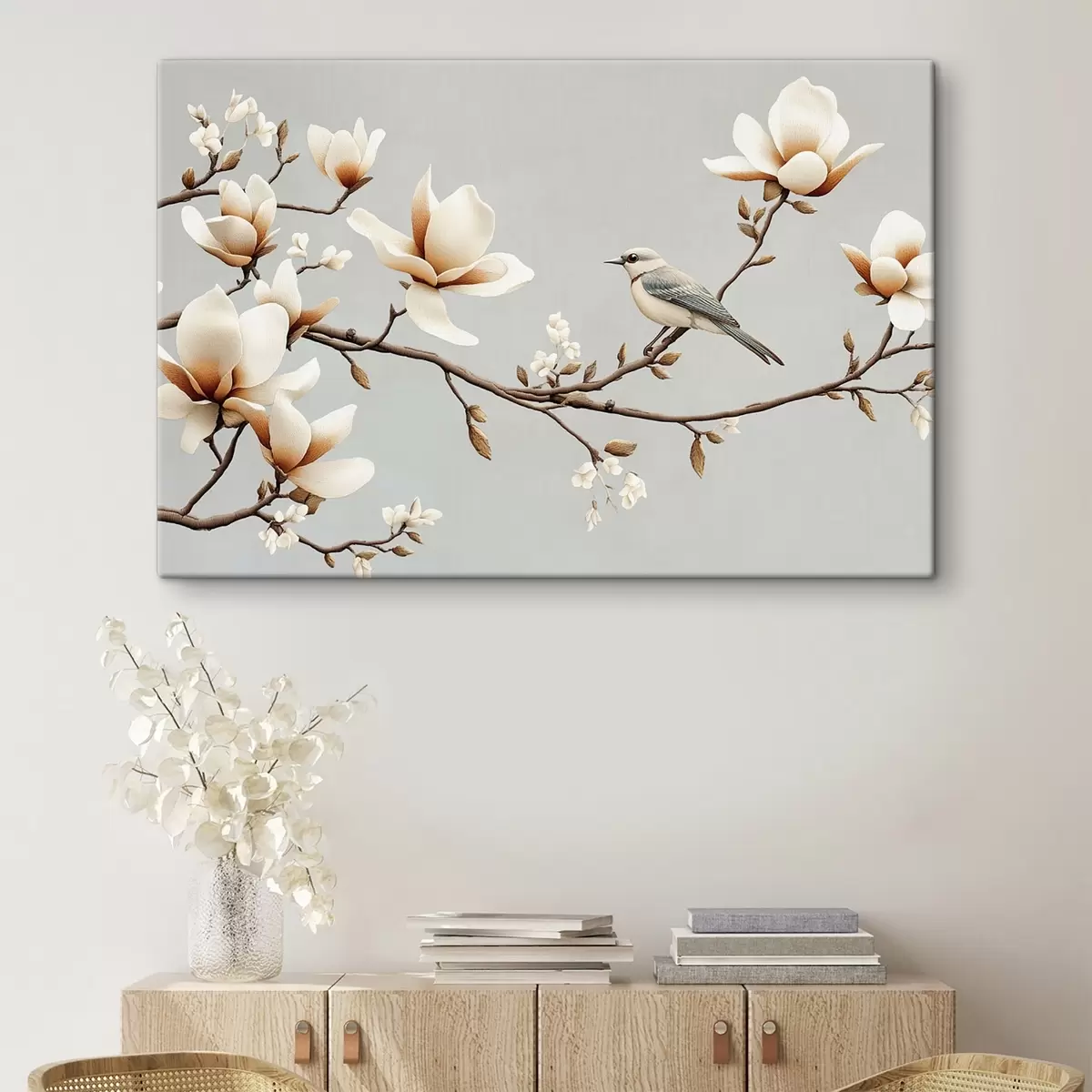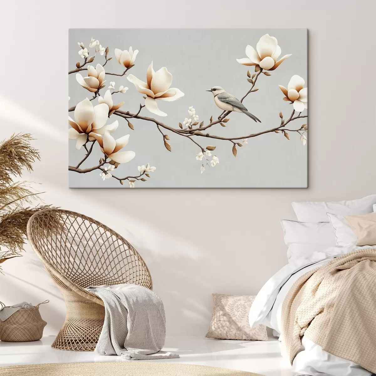 Paveikslas Paukštis ant šakos su švelnių pastelinių spalvų magnolijomis Nr s43320