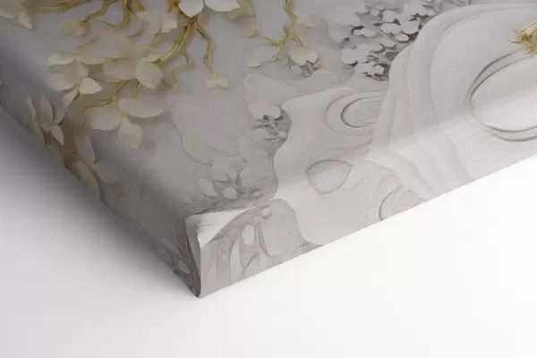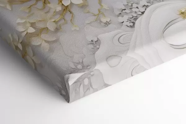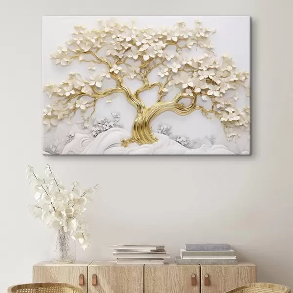 Paveikslas Dekoratyvinis medis su baltomis gėlėmis, baltas fonas, baltos uolos, sudėtingos detalės, gamtos įkvėptas menas Nr s43388