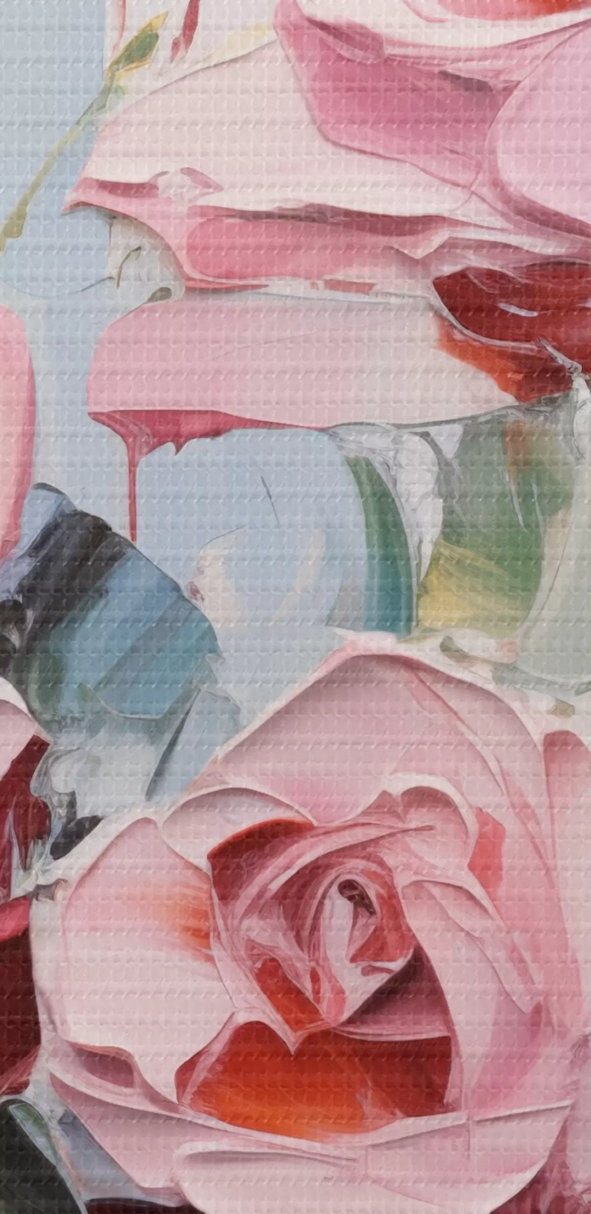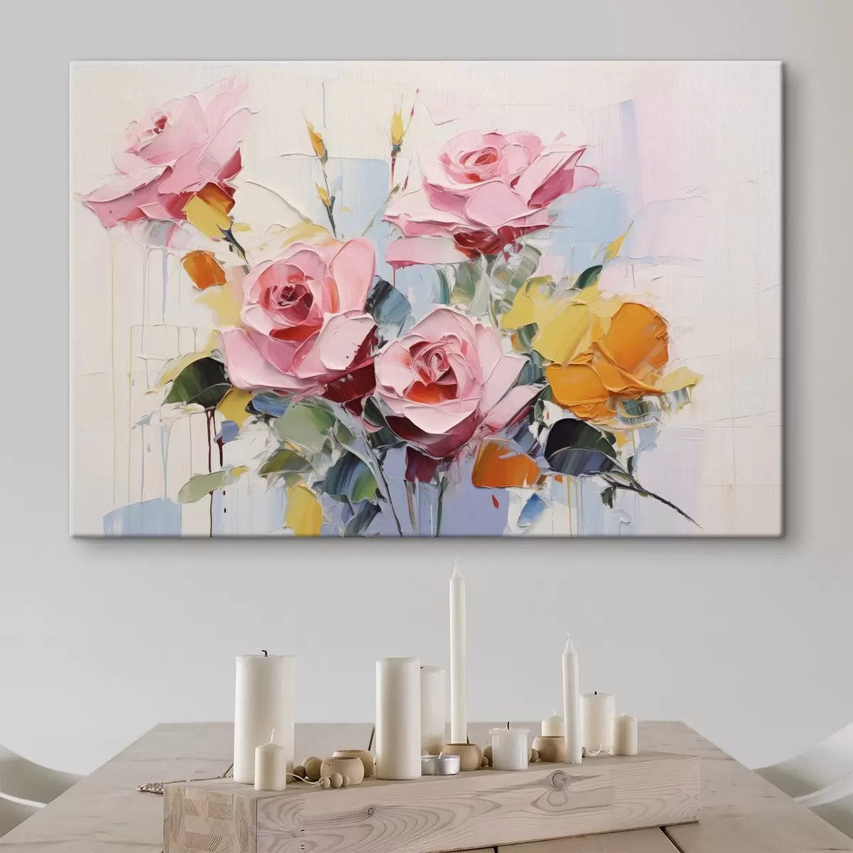 Paveikslas Šiuolaikinis abstraktus rožinių ir geltonų rožių su lapais menas, stori potėpiai, aliejinės tapybos imitacija, pastelinės spalvos Nr s43392