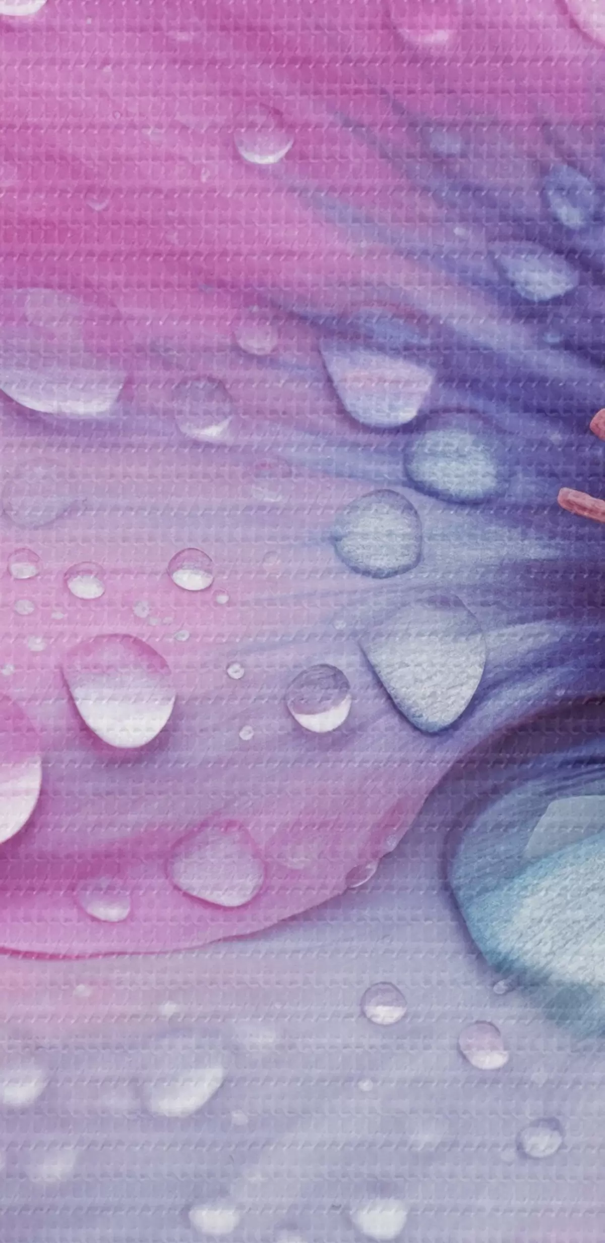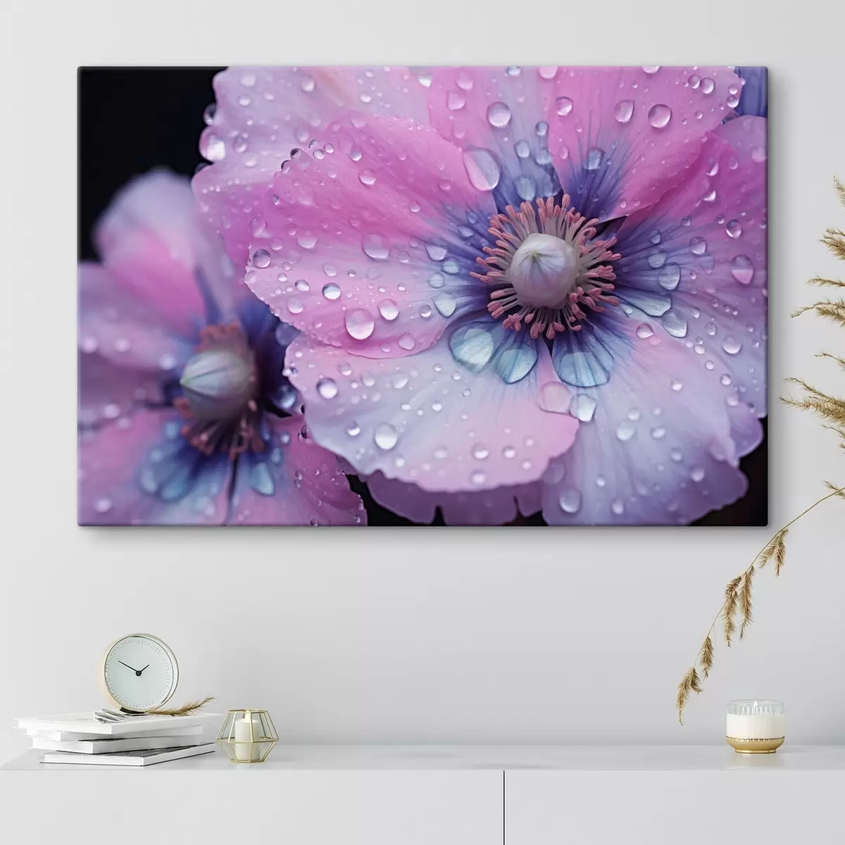 Paveikslas Tamsiame fone žydinčios rožinės ir violetinės gėlės, padengtos vandens lašeliais Nr s43394