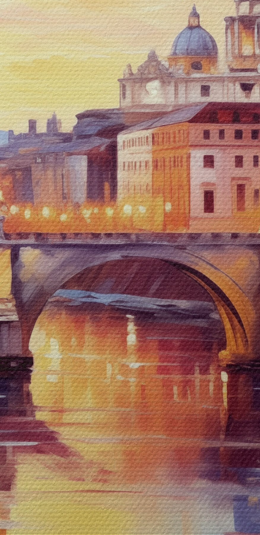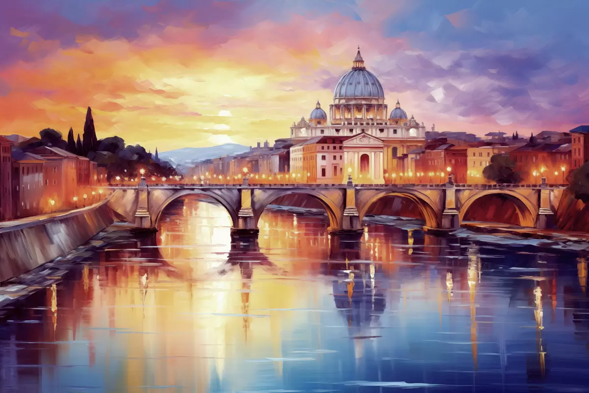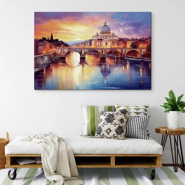 Paveikslas Šventojo Petro bazilika ir tiltas per upę saulėlydžio metu, šiltos spalvos, atspindys vandenyje, aliejinės tapybos stilius Nr s43396