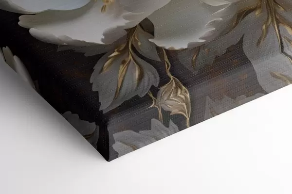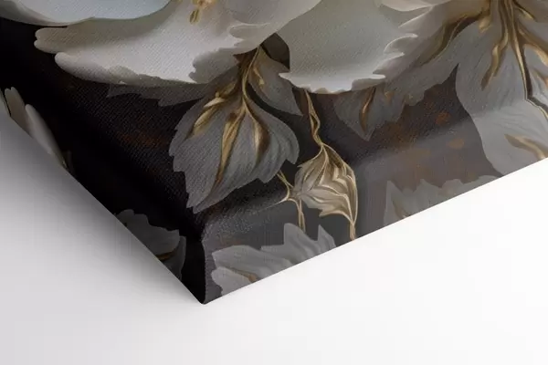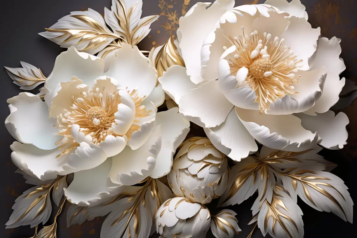 Paveikslas Balti ir geltoni bijūnai su lapais, sudėtingos detalės, dekoratyvinis menas, tamsus fonas Nr s43399