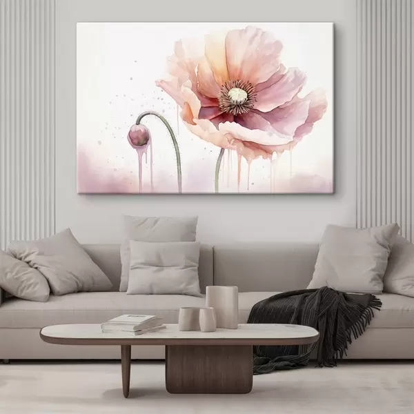 Paveikslas Rožinė aguona su pumpuru baltame fone, akvarelės tapybos imitacija su lašelinėmis, švelnios spalvos Nr s43402