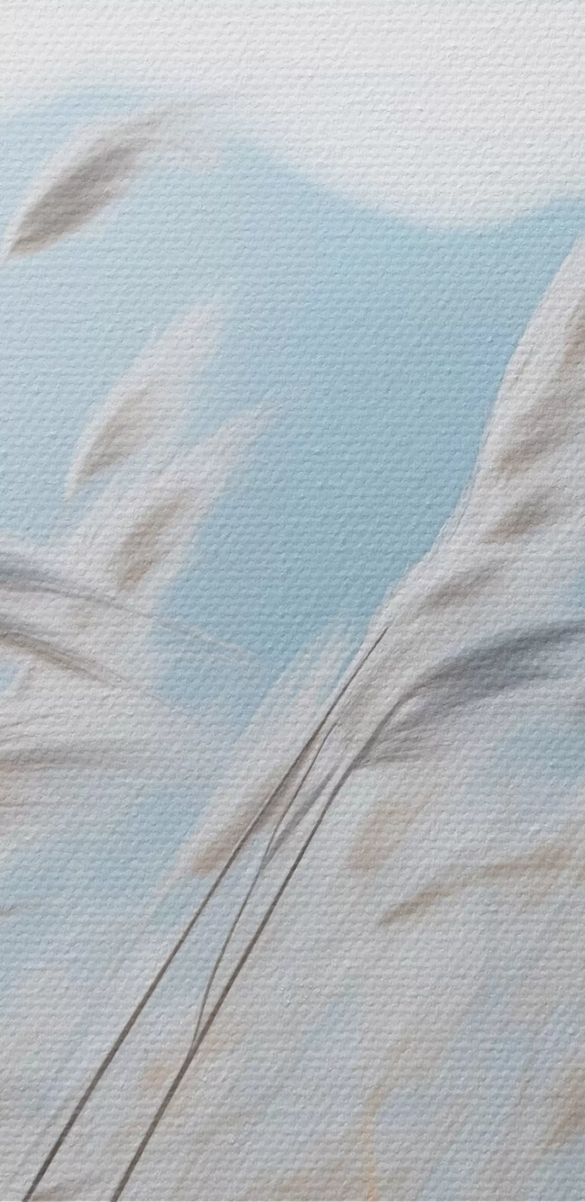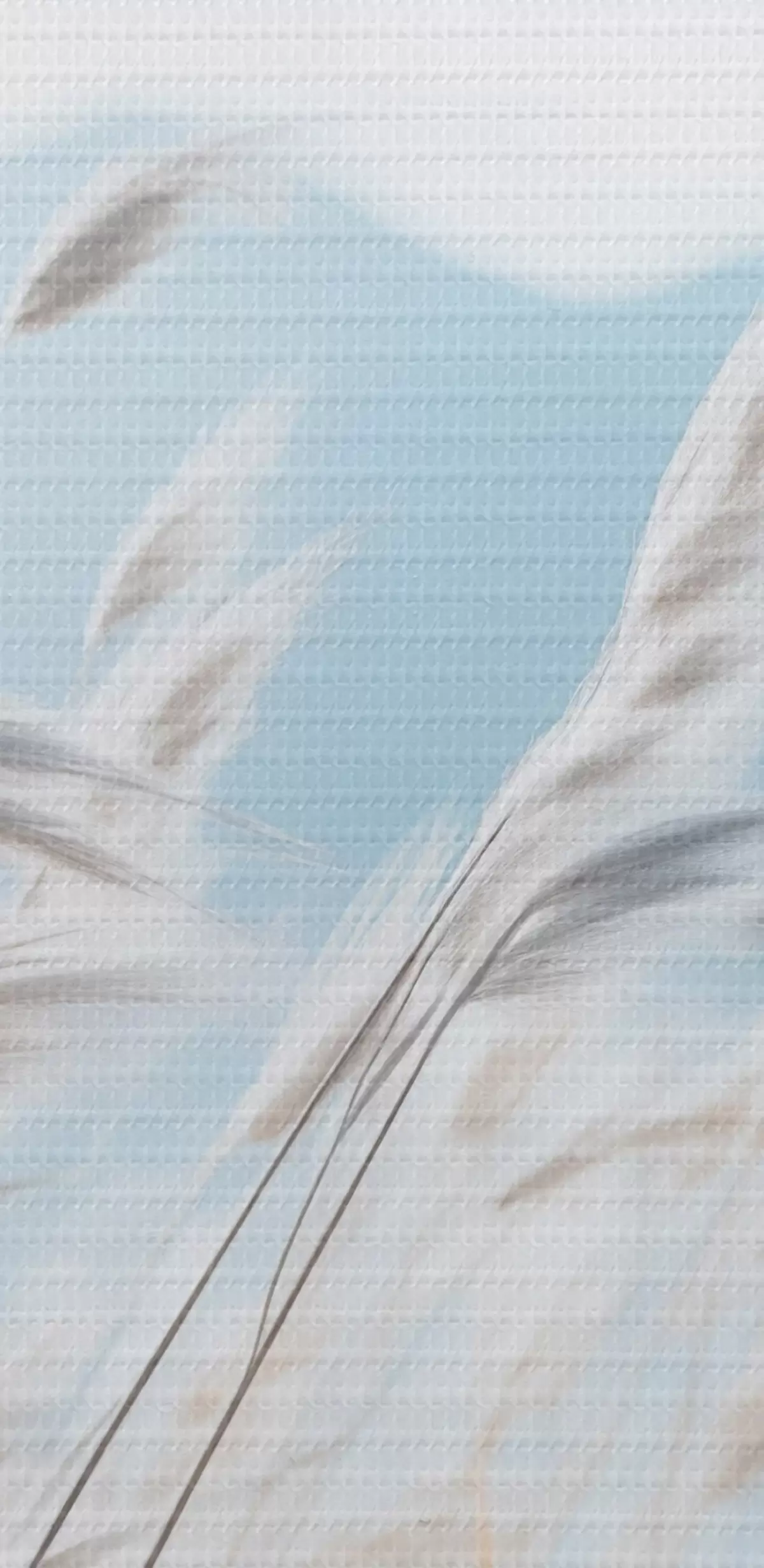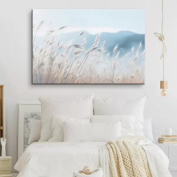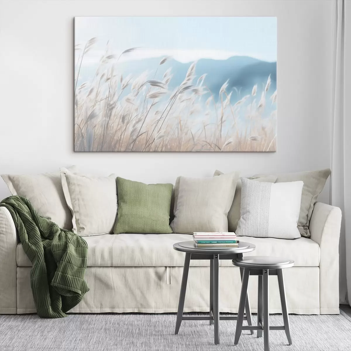 Paveikslas Žolė, pampų laukas su mėlynu kalnu fone, šviesiai mėlynas dangus, minimalistinis, pastelinės spalvos Nr s43404