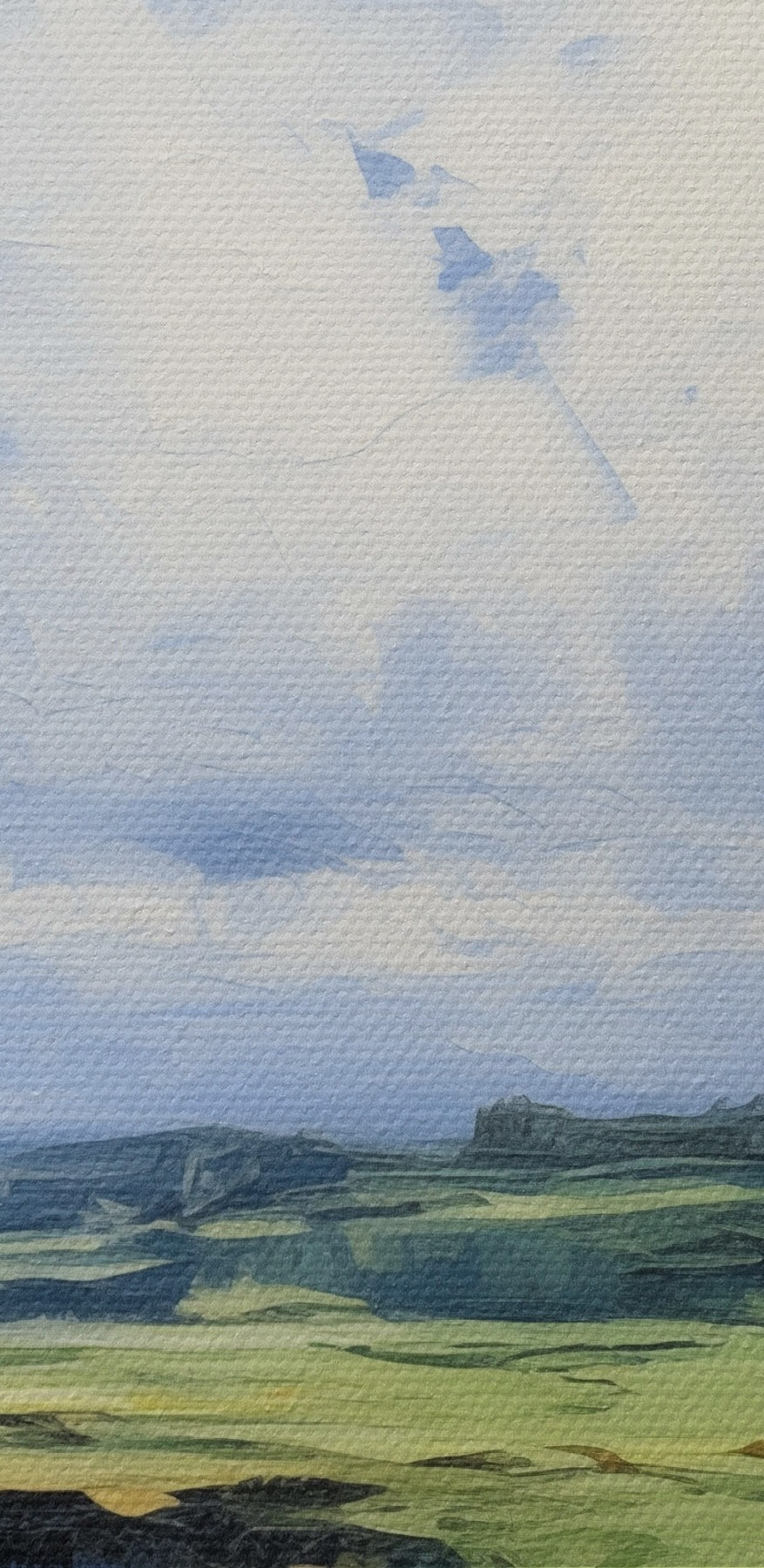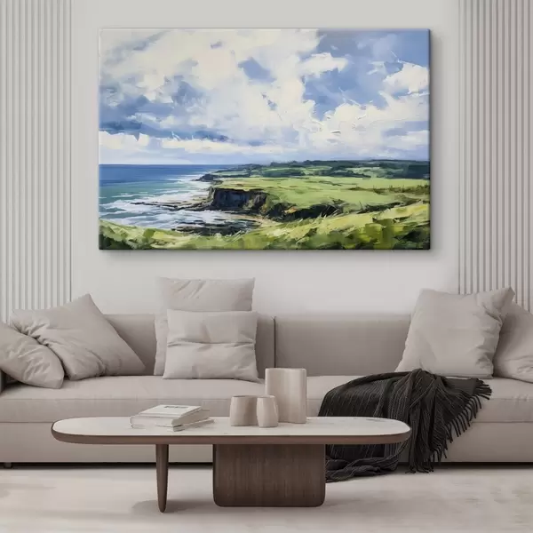 Paveikslas Žalias laukas su uolos pakrantėje, mėlyna jūra su bangomis, debesuotas dangus, minimalistinis modernus aliejaus tapybai imitacija Nr s43406