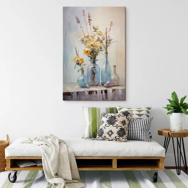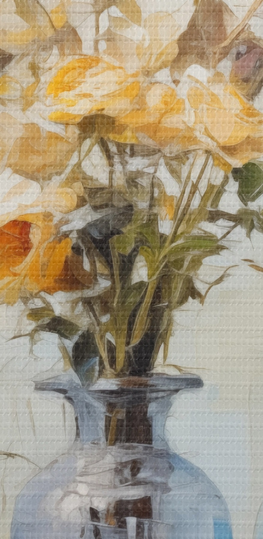 Paveikslas Geltonų rožių natiurmortas mėlynose stiklinėse vazose, lengvos tekstūros fonas, švelnūs teptuko potėpiai, aliejinės tapybos stilius Nr s43409