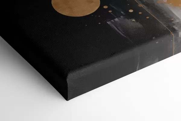 Paveikslas Abstraktus menas su geltonais apskritimais, kabančiais juodai baltame fone su baltomis ir geltonomis dėmėmis Nr s43410