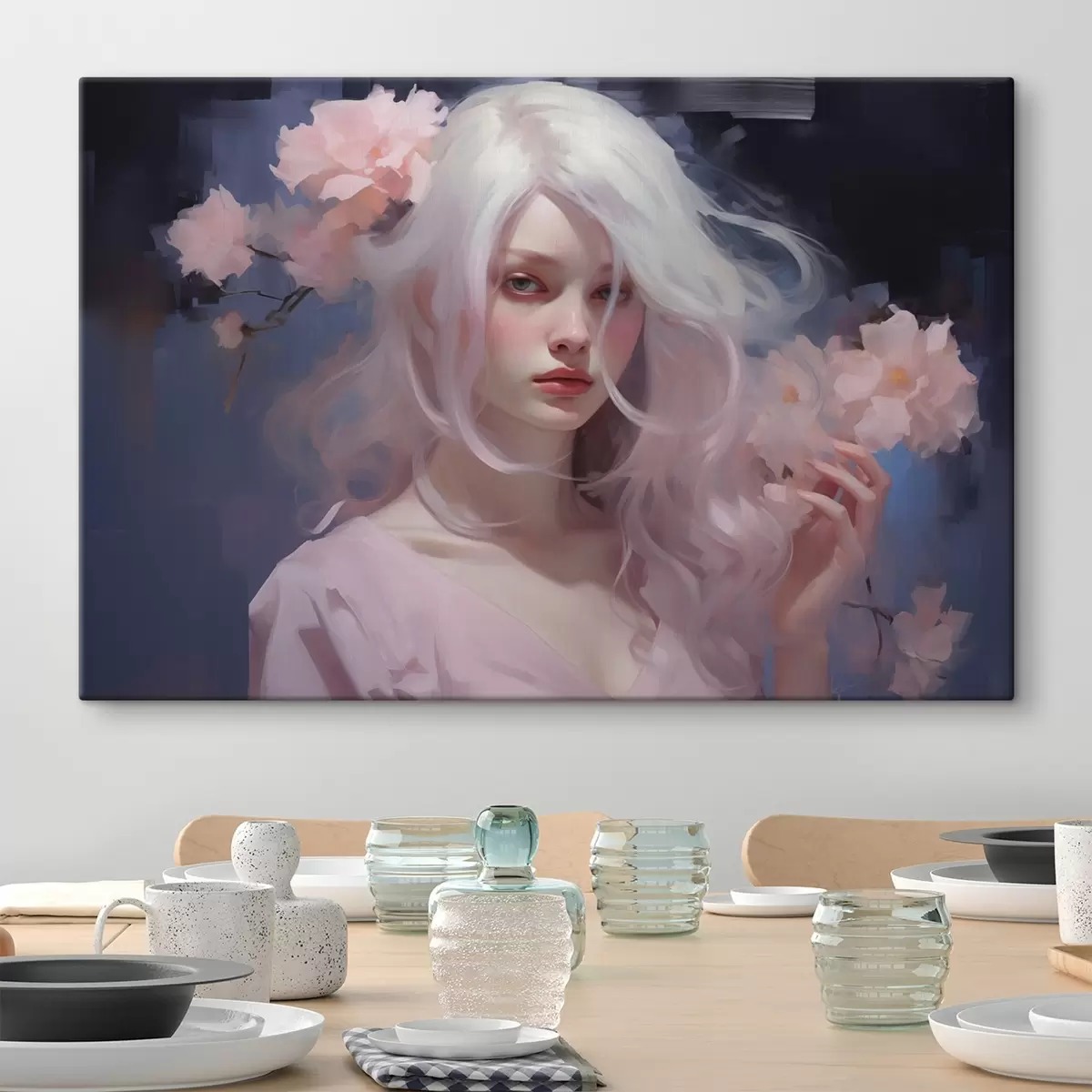 Paveikslas Mergaitė su bijūnais, akrilo stiliaus piešinys, tamsus fonas Nr s43496