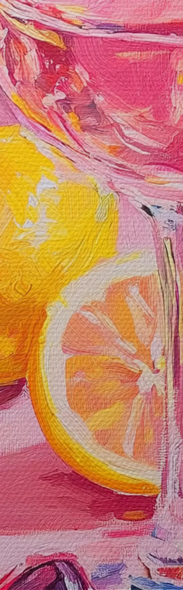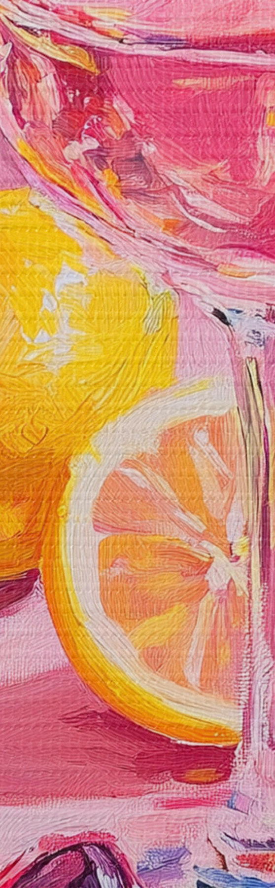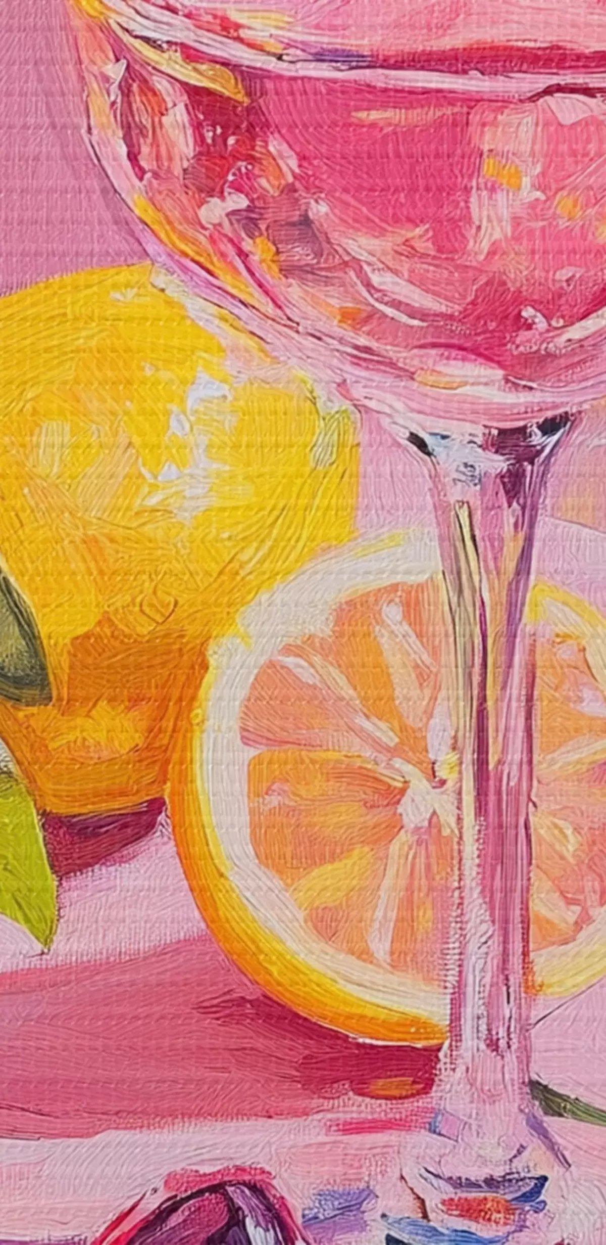 Paveikslas Stiklinė vyno su citrinomis, akiniai nuo saulės, abstrakcija, aliejaus stiliaus piešinys, rožinės spalvos Nr s43883