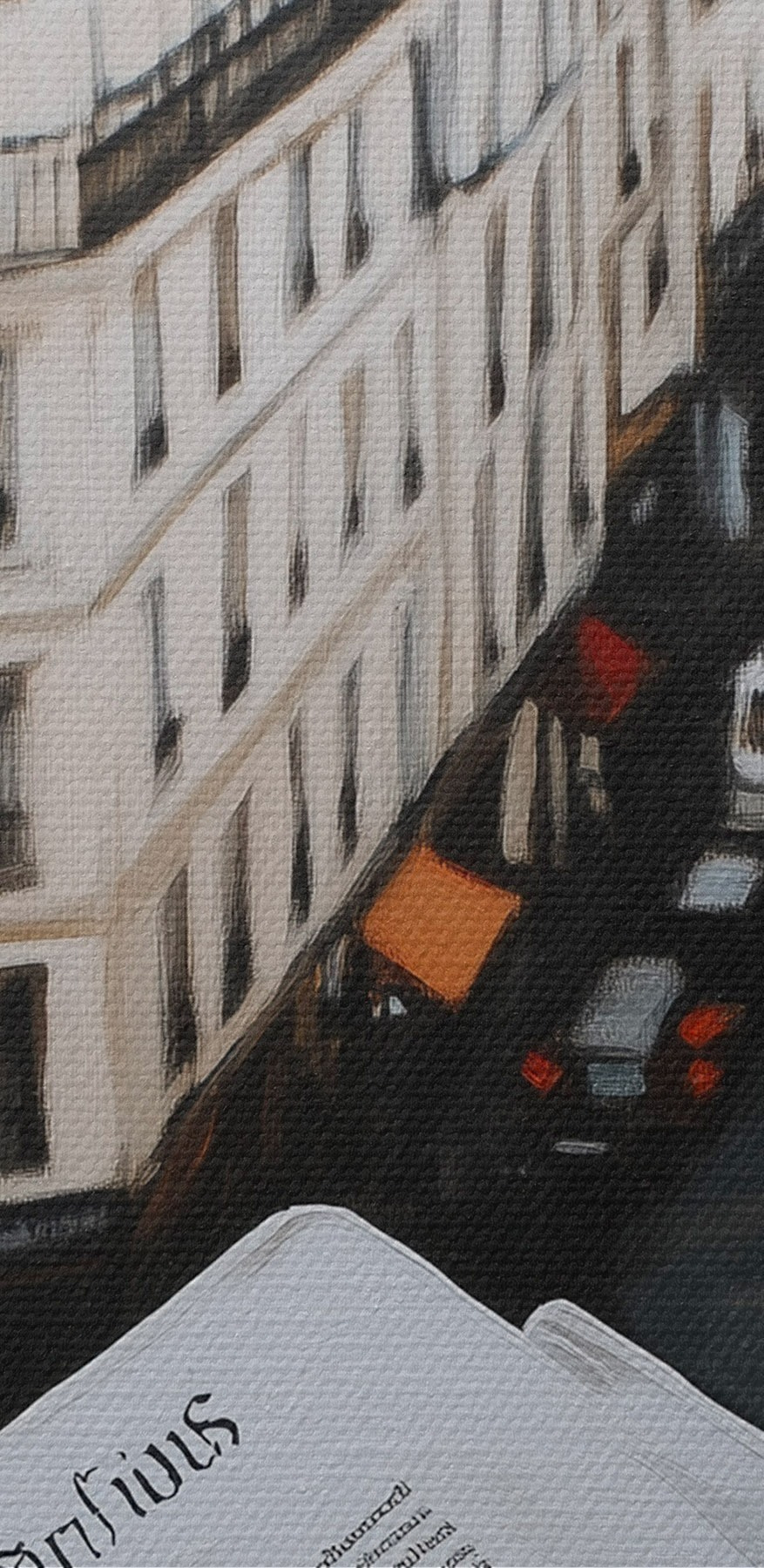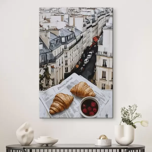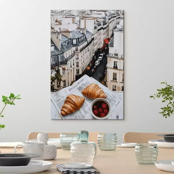 Paveikslas Rytinė kava su kruasanais, miesto gatvė, architektūrinis, aliejinis stilius Nr s43891