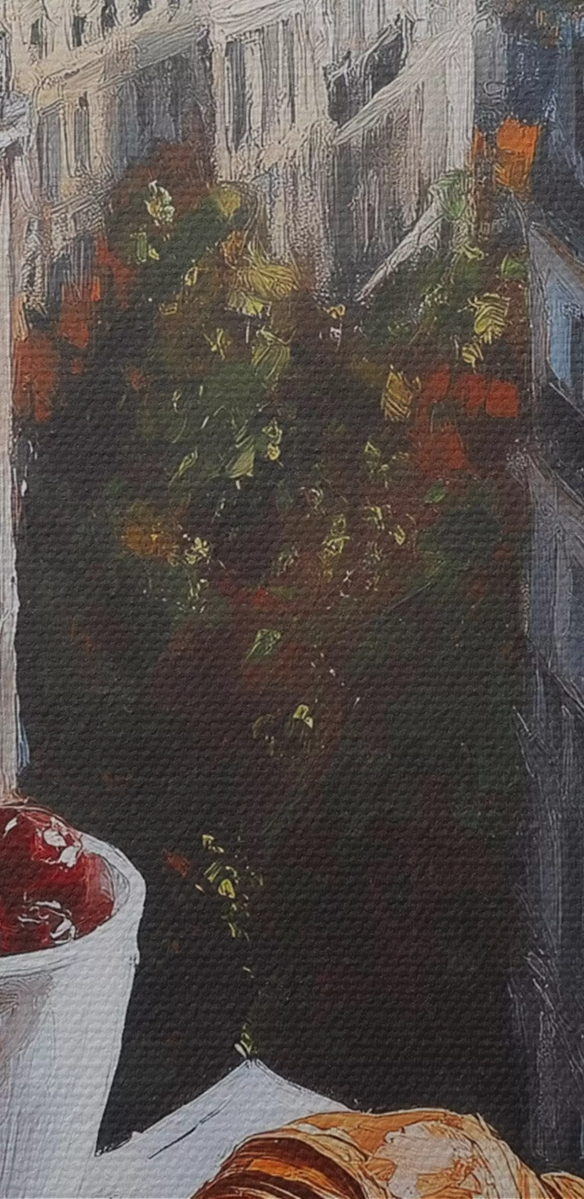 Paveikslas Paryžiaus rytas, kava su kruasanais, miesto vaizdas, piešinys aliejiniais dažais Nr s43892
