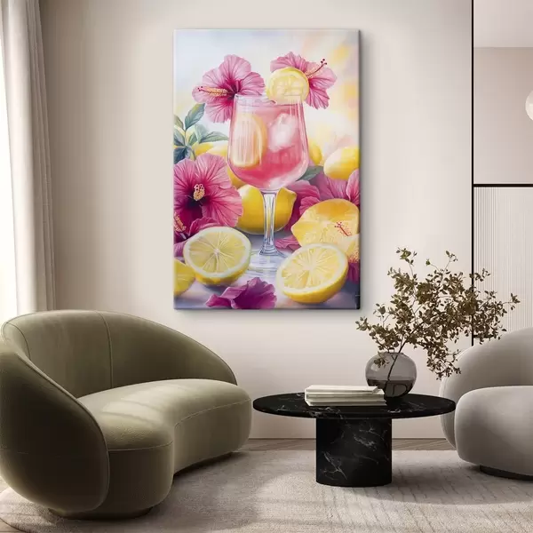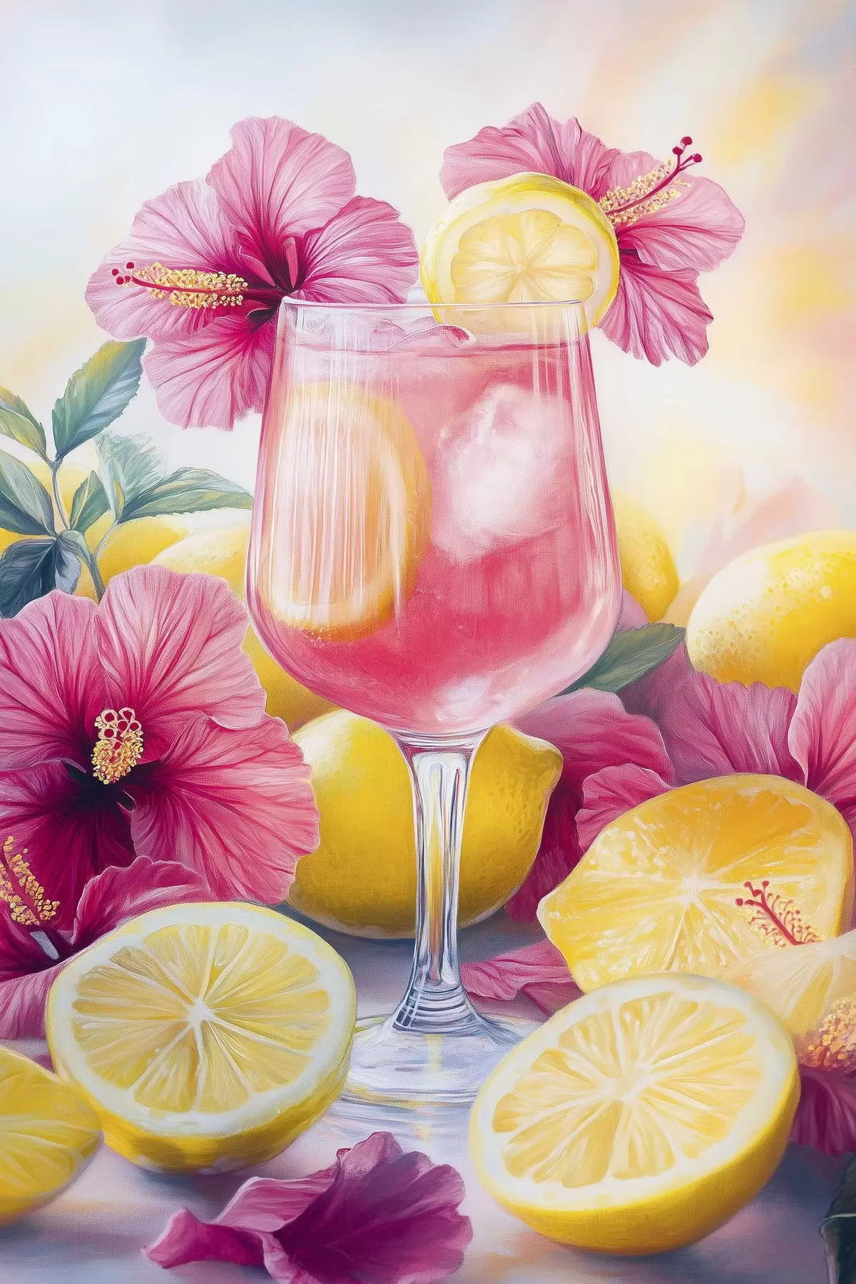 Paveikslas Spalvingas kokteilis su hibiskuso gėlėmis ir citrinomis, vasara, akvarelės stilius Nr s43894