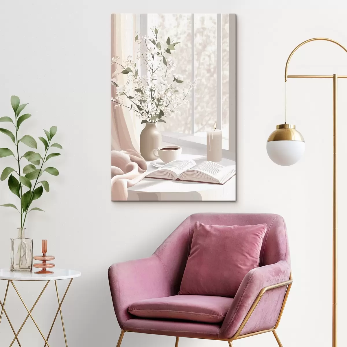 Paveikslas Pavasario rytas su kava ir gėlėmis, švelnios pastelinės spalvos Nr s44015