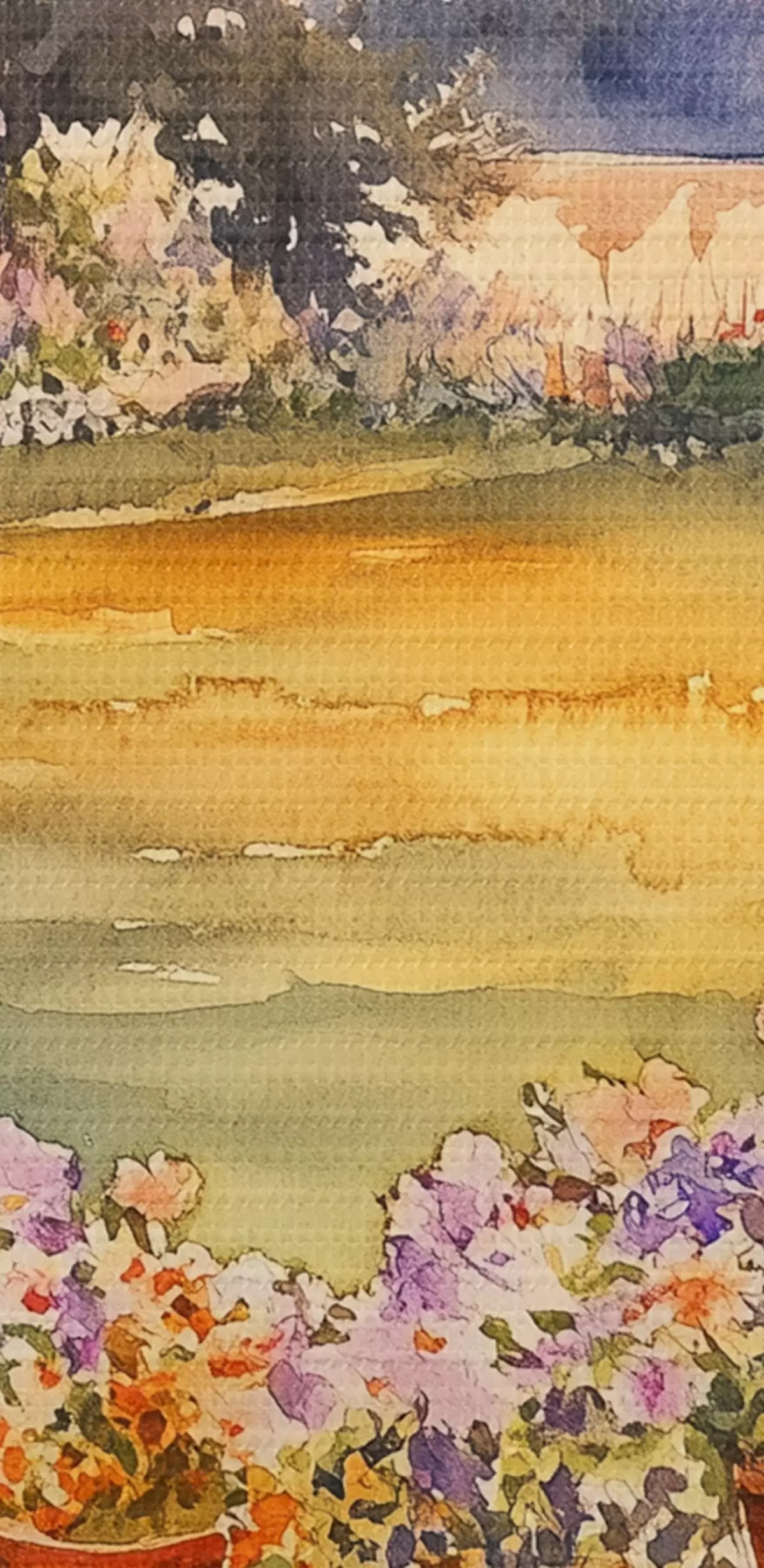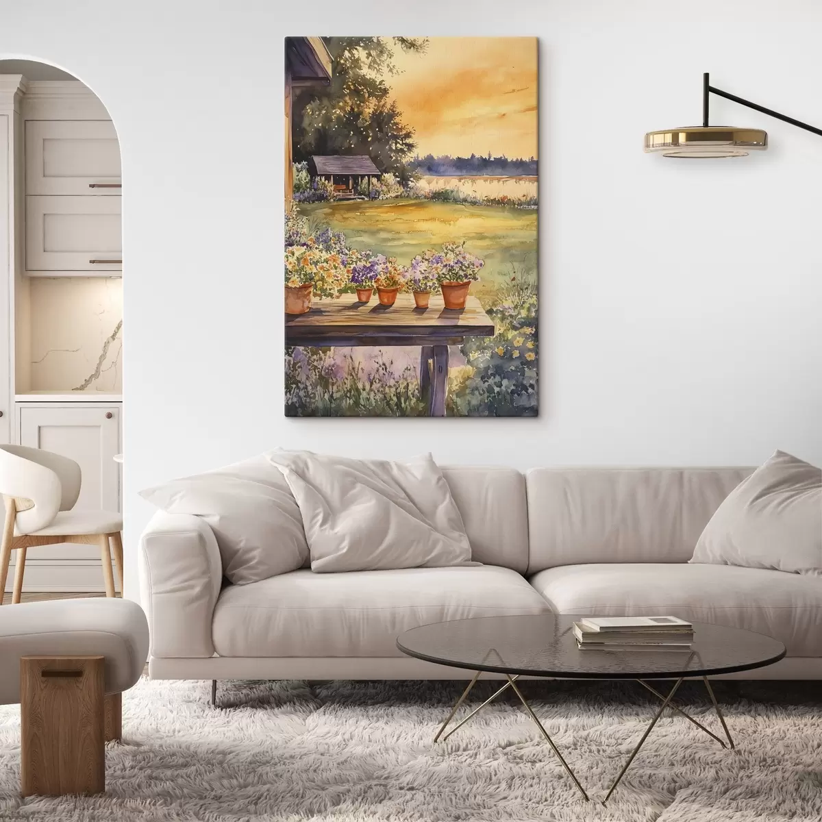 Paveikslas Gėlės kaimo sode, saulėlydžio spalvos, akvarelės stilius Nr s44019