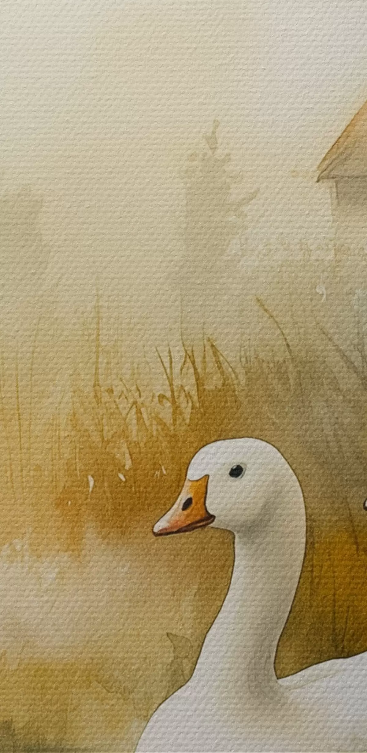 Paveikslas Žąsys ežere netoli sodybos, kaimiškas, akvarelės stilius Nr s44022