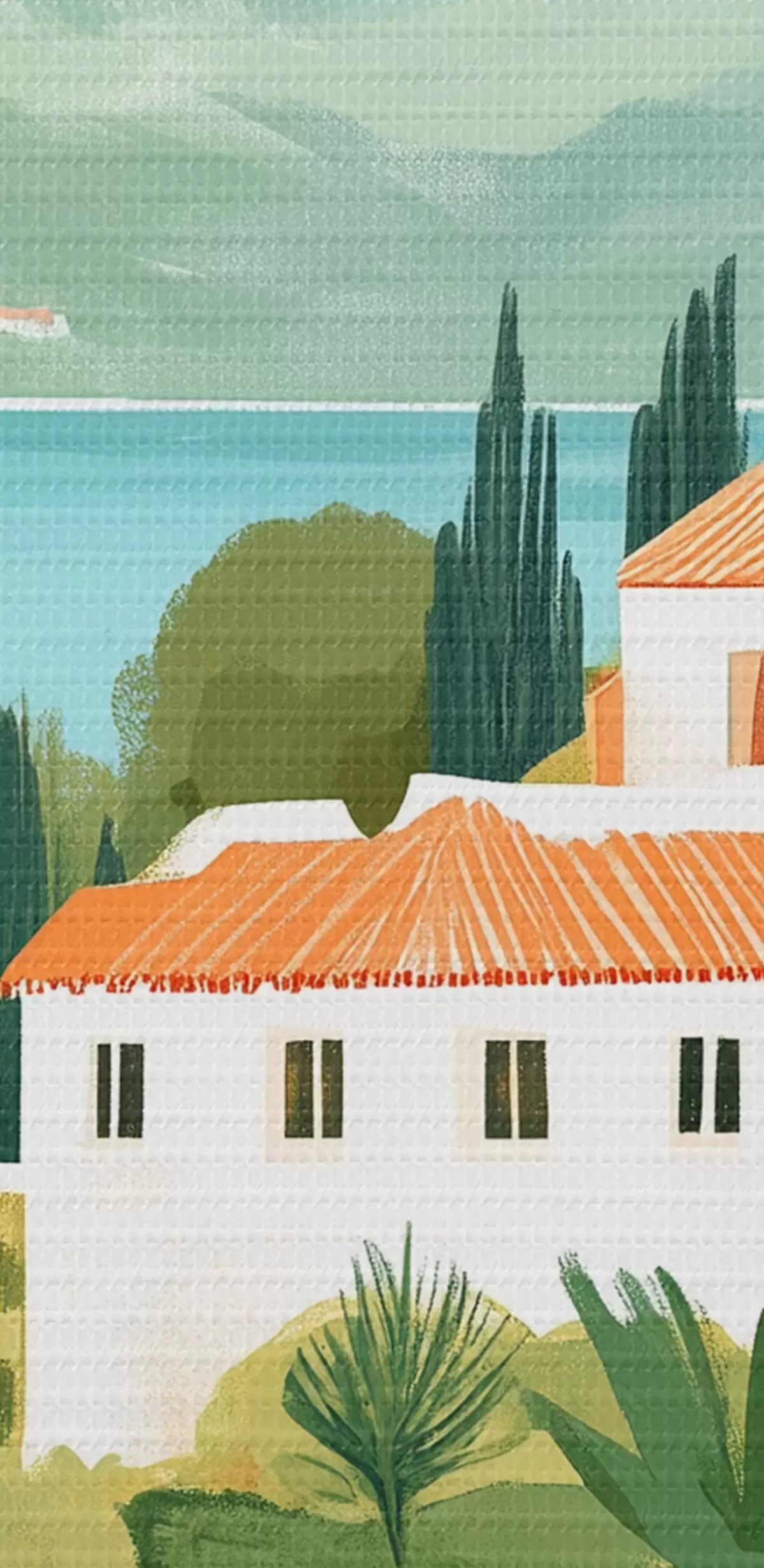 Paveikslas Viduržemio jūros kraštovaizdis su apelsinmedžiais ir namais, jūros pakrantė Nr s44027