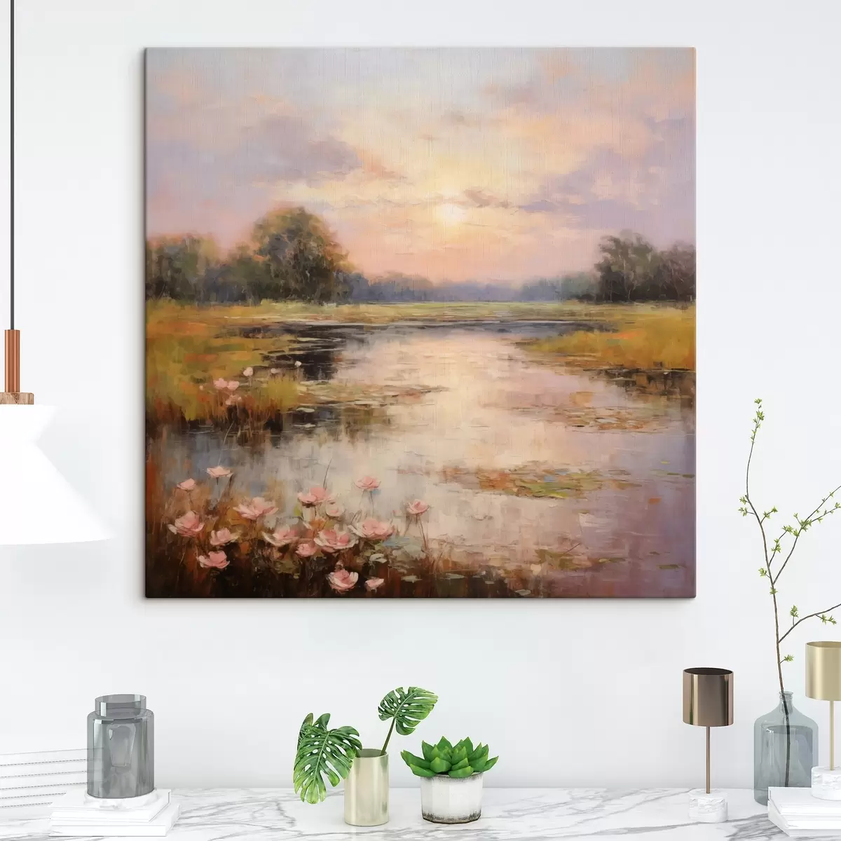 Paveikslas Vandens telkinys su gėlėmis saulėlydžio metu Nr s44044