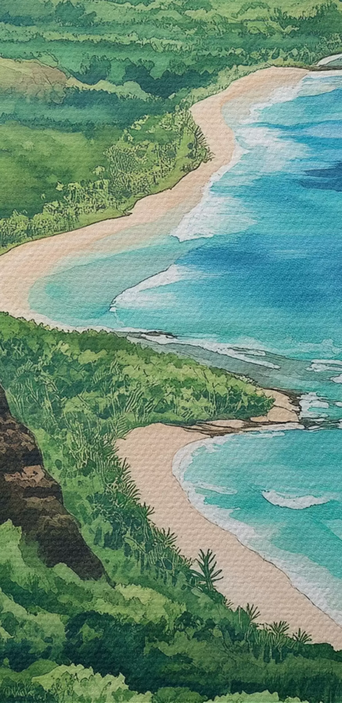 Paveikslas Žalieji kalnai, Havajai, vandenynas, tropinis, akvarelės stilius Nr s44143