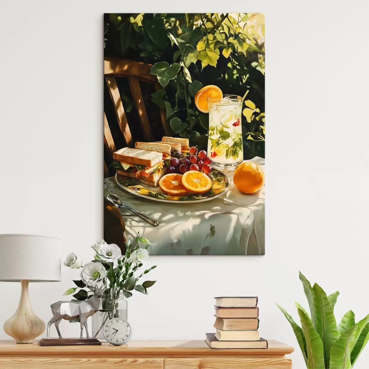 Paveikslas Estetiškas piknikas vasaros sode, sumuštiniai, apelsinai, limonadas Nr s44306