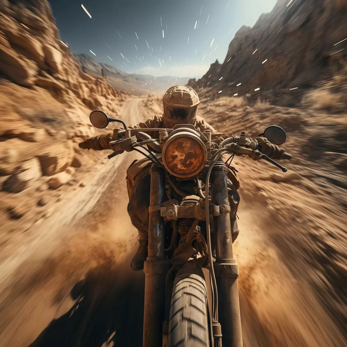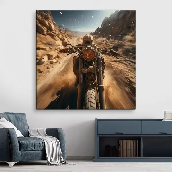 Paveikslas Motociklininkas, važiuojantis dykumos keliu dideliu greičiu Nr s44361