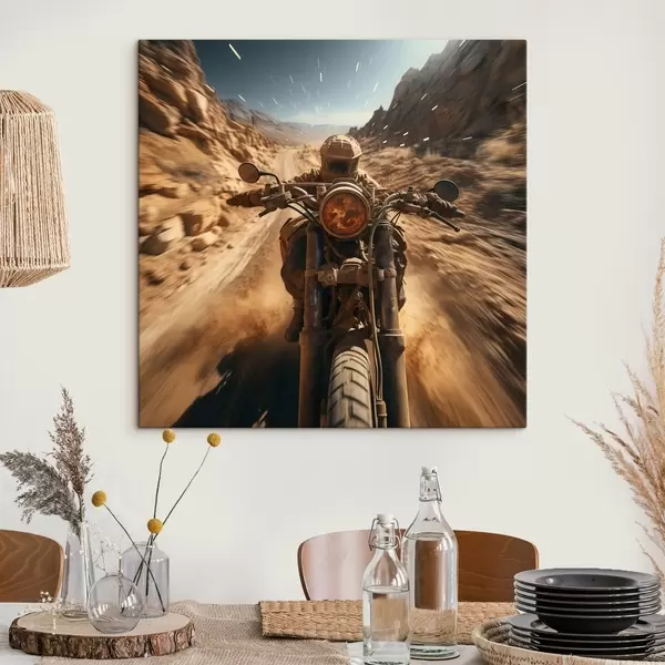 Paveikslas Motociklininkas, važiuojantis dykumos keliu dideliu greičiu Nr s44361