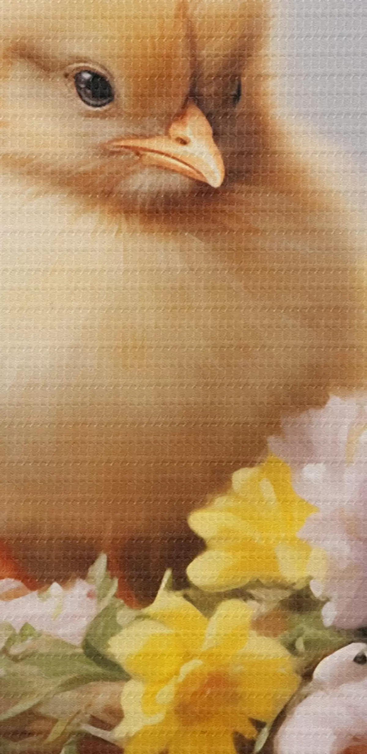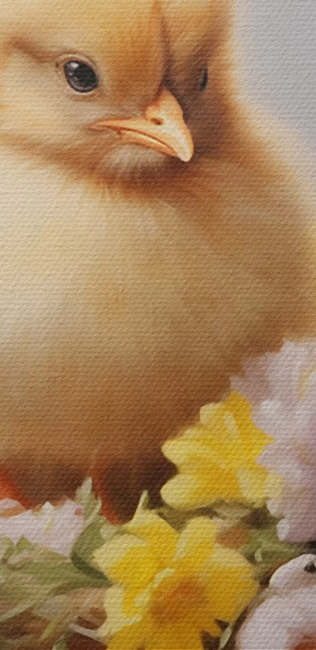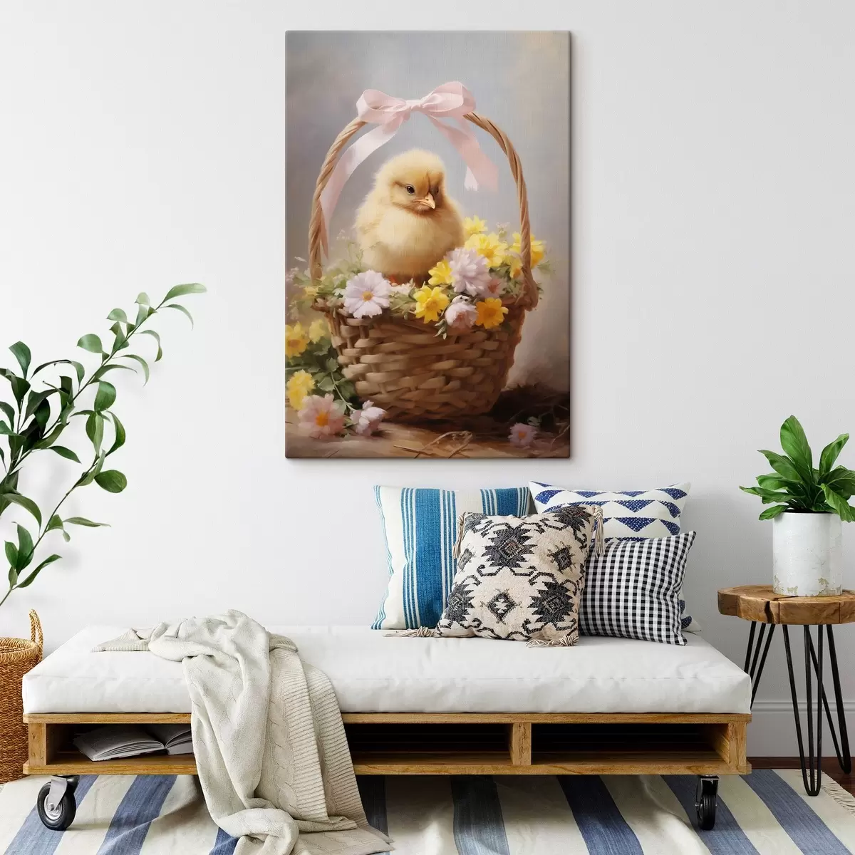 Paveikslas Geltonas viščiukas krepšelyje su laukinėmis gėlėmis Nr s44384