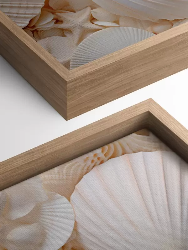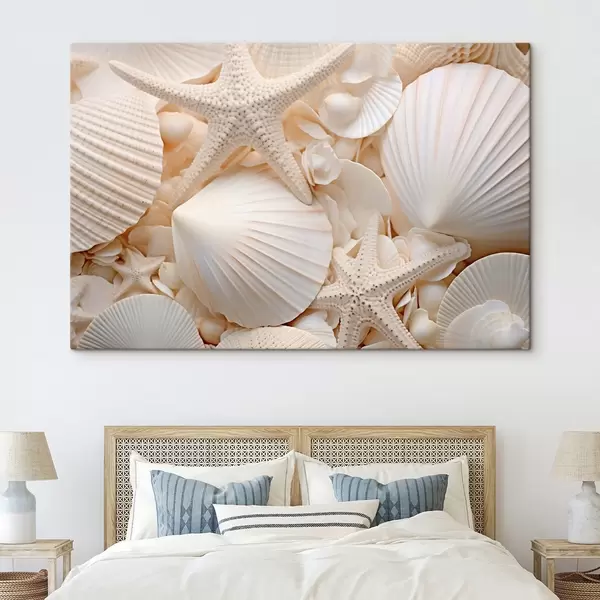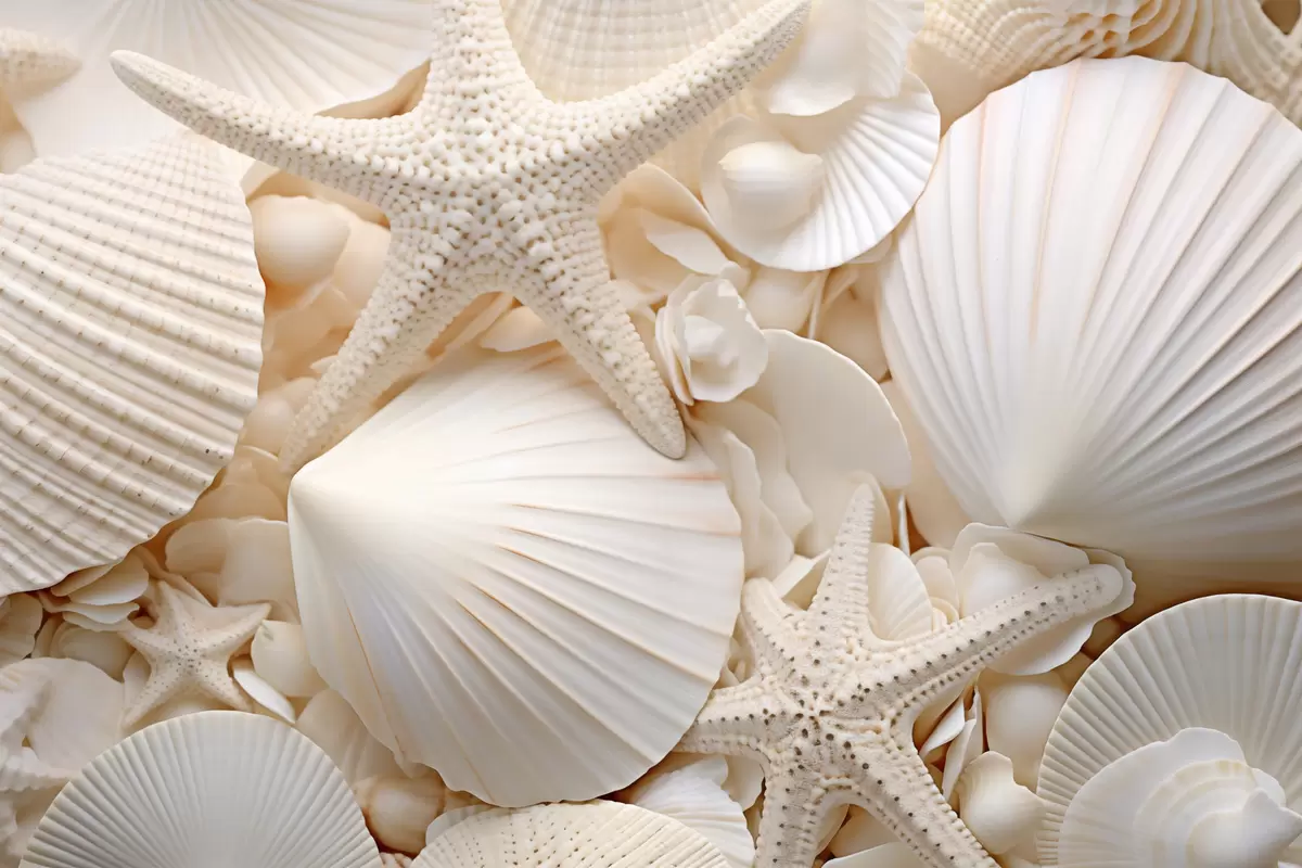 Paveikslas Dekoratyvinės baltos kriauklės ir jūrų žvaigždės, sukuriančios faktūrinę vienspalvę kompoziciją Nr s44392