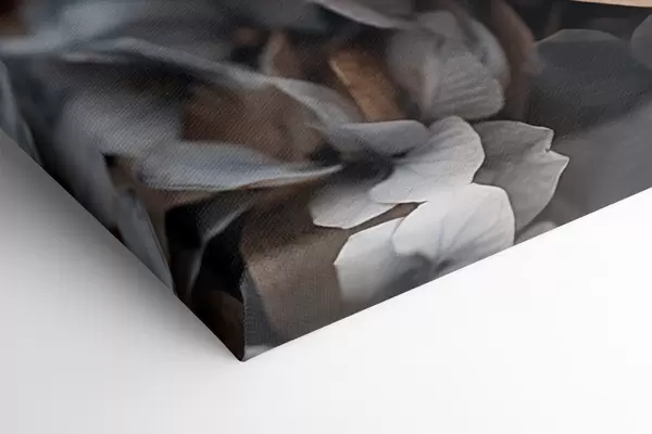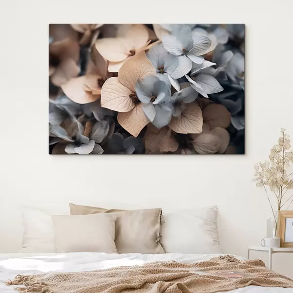 Paveikslas Hortenzijos gėlės, šviesiai mėlyni ir smėlio spalvos žiedlapiai, su detalių tekstūrų, elegantiška gėlių kompozicija Nr s44394