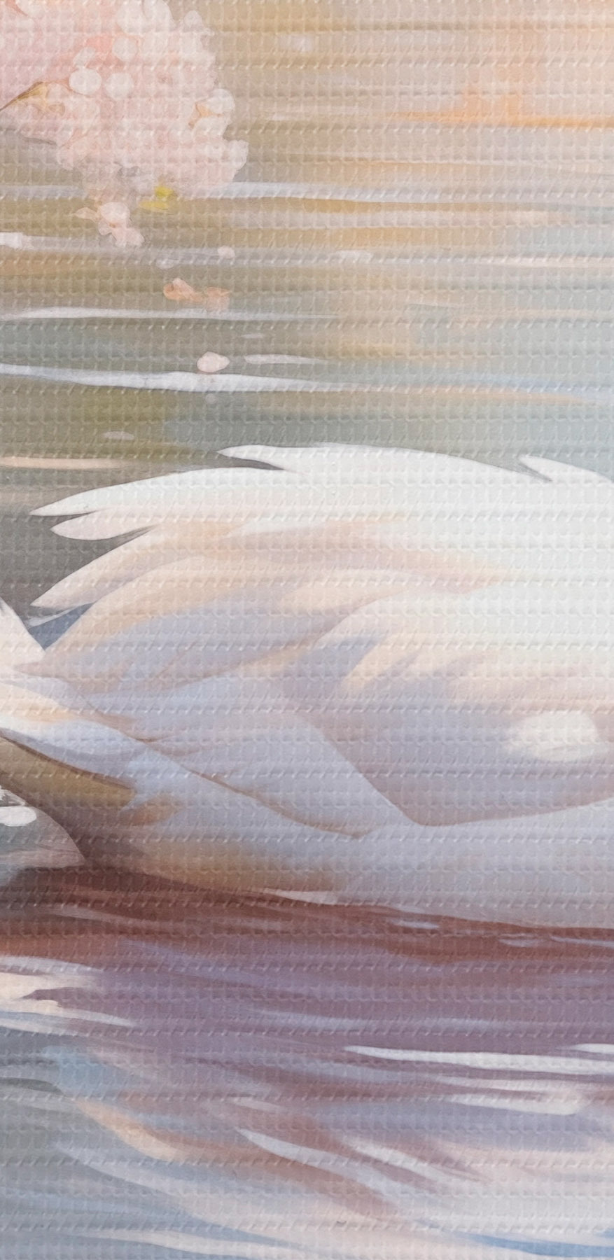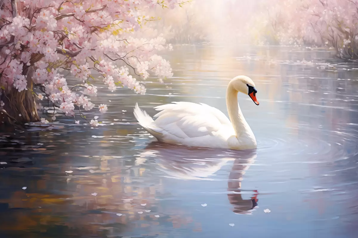 Paveikslas Balta gulbė, plaukiojanti ežere su žydinčiomis vyšniomis, pastelinės spalvos Nr s44396