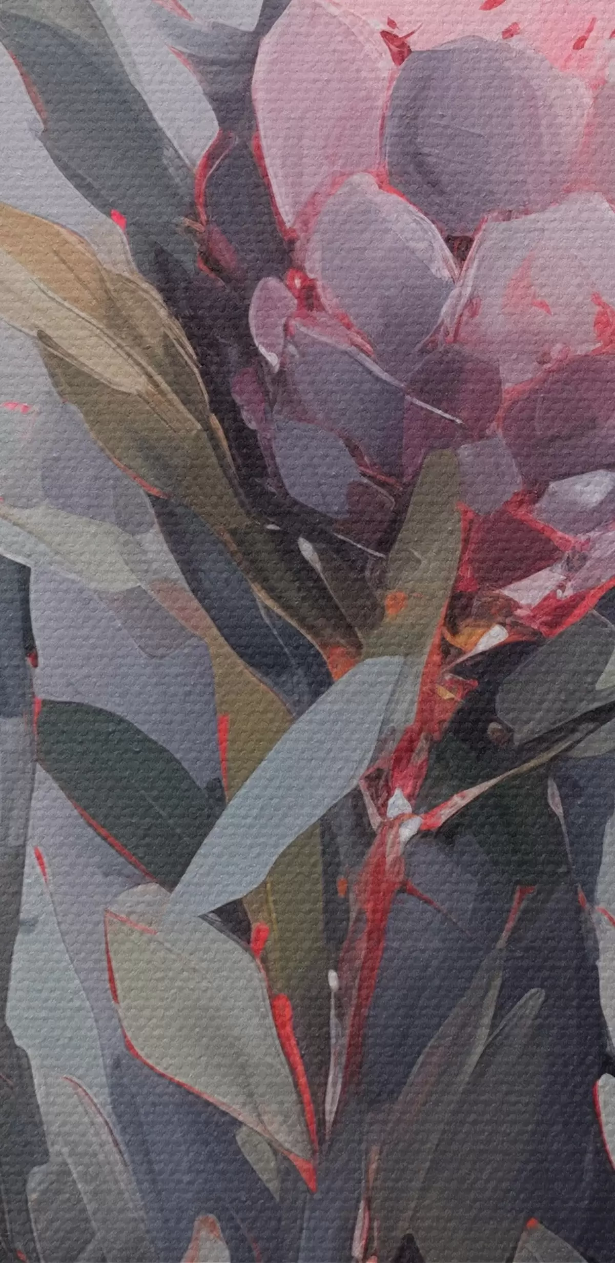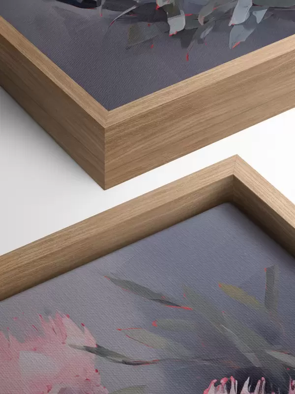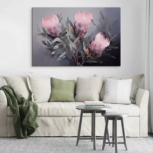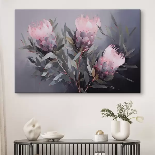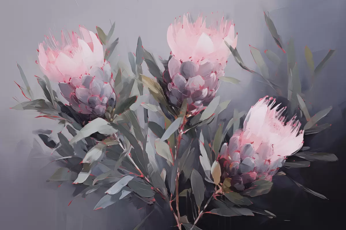 Paveikslas Rožinės protea gėlės su žaliais lapais, minkšti potėpiai, tamsios spalvos, elegantiška kompozicija Nr s44400