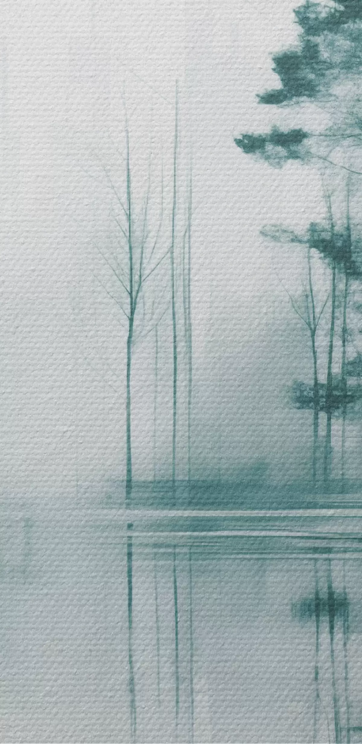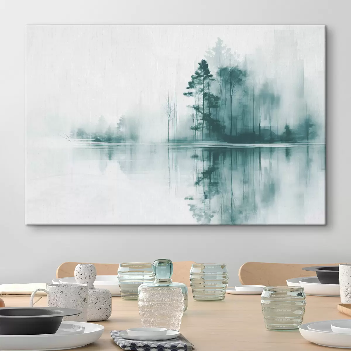 Paveikslas Abstraktus miškas su aukštais medžiais, atsispindinčiais vandenyje, prislopinta spalvų paletė Nr s44403