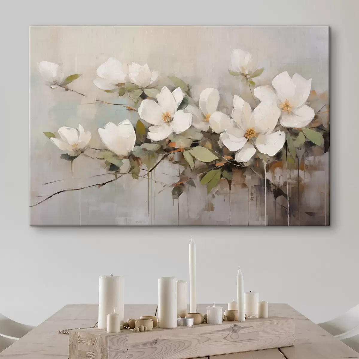 Paveikslas Baltos magnolijos žiedai su žaliais lapais ant šakos, švelnūs potėpiai, prislopintos spalvos Nr s44404