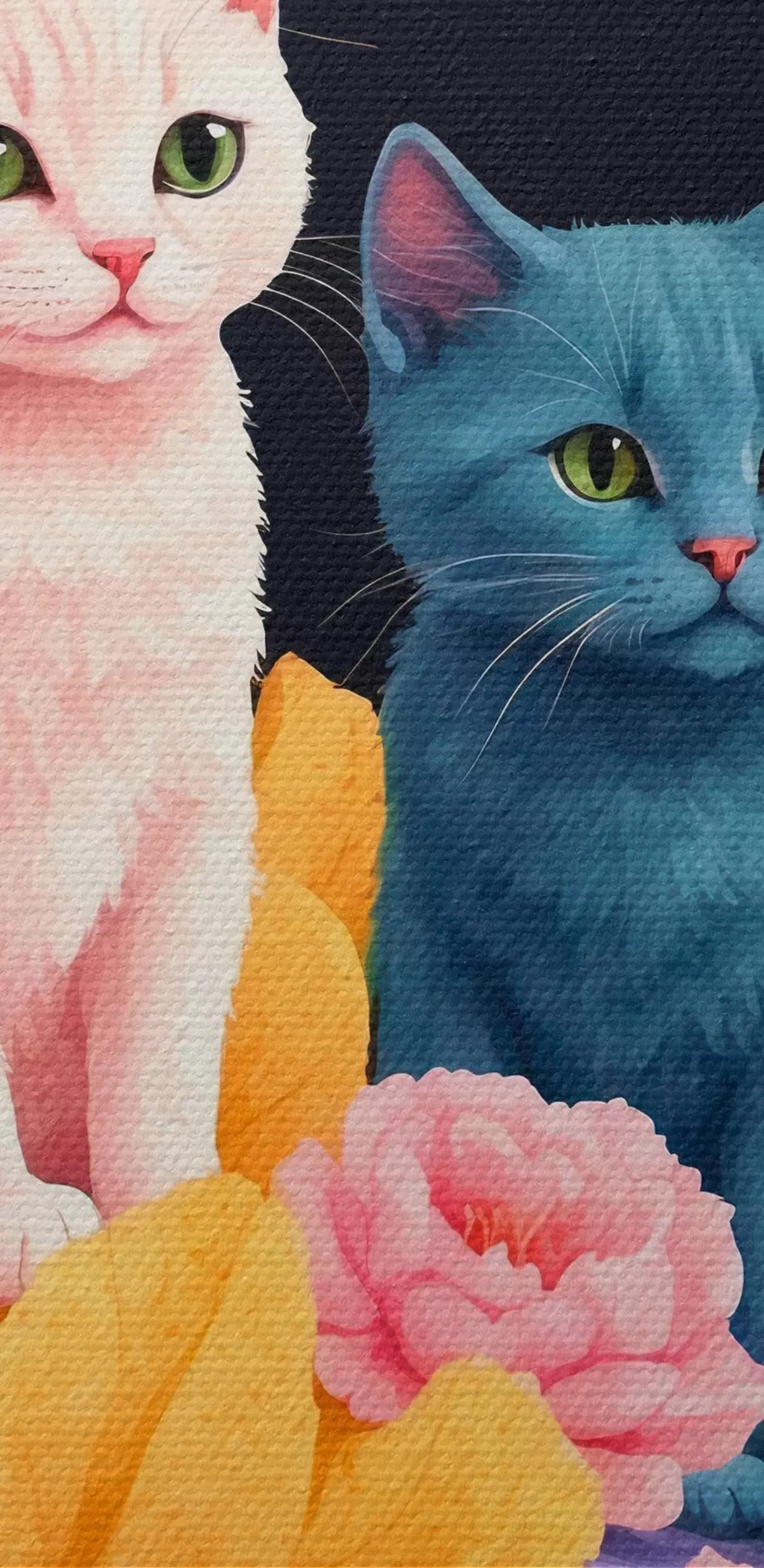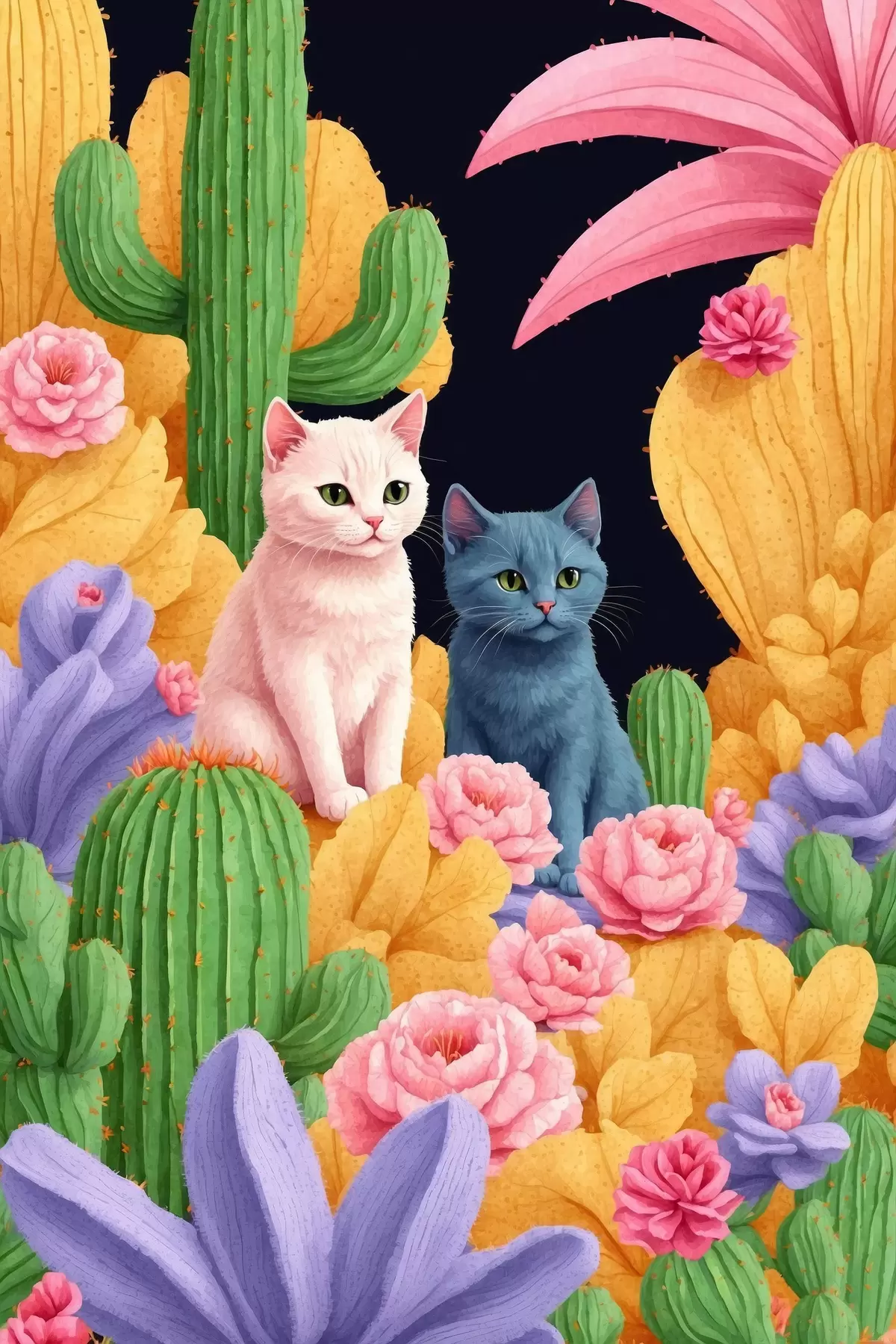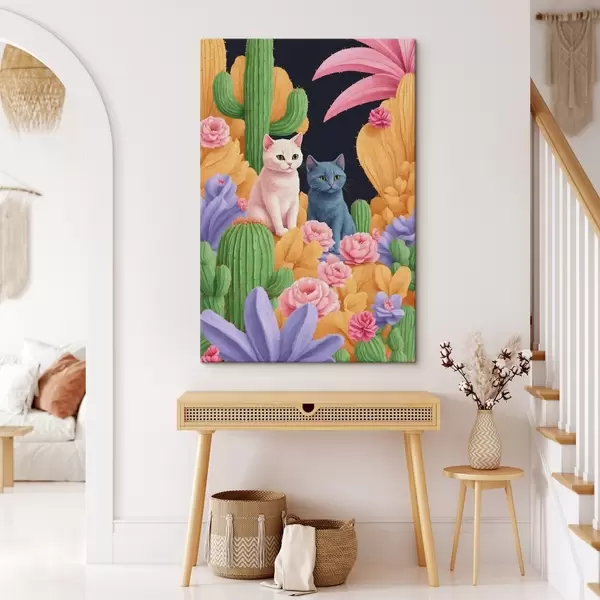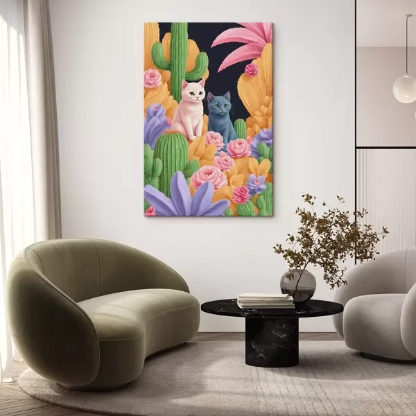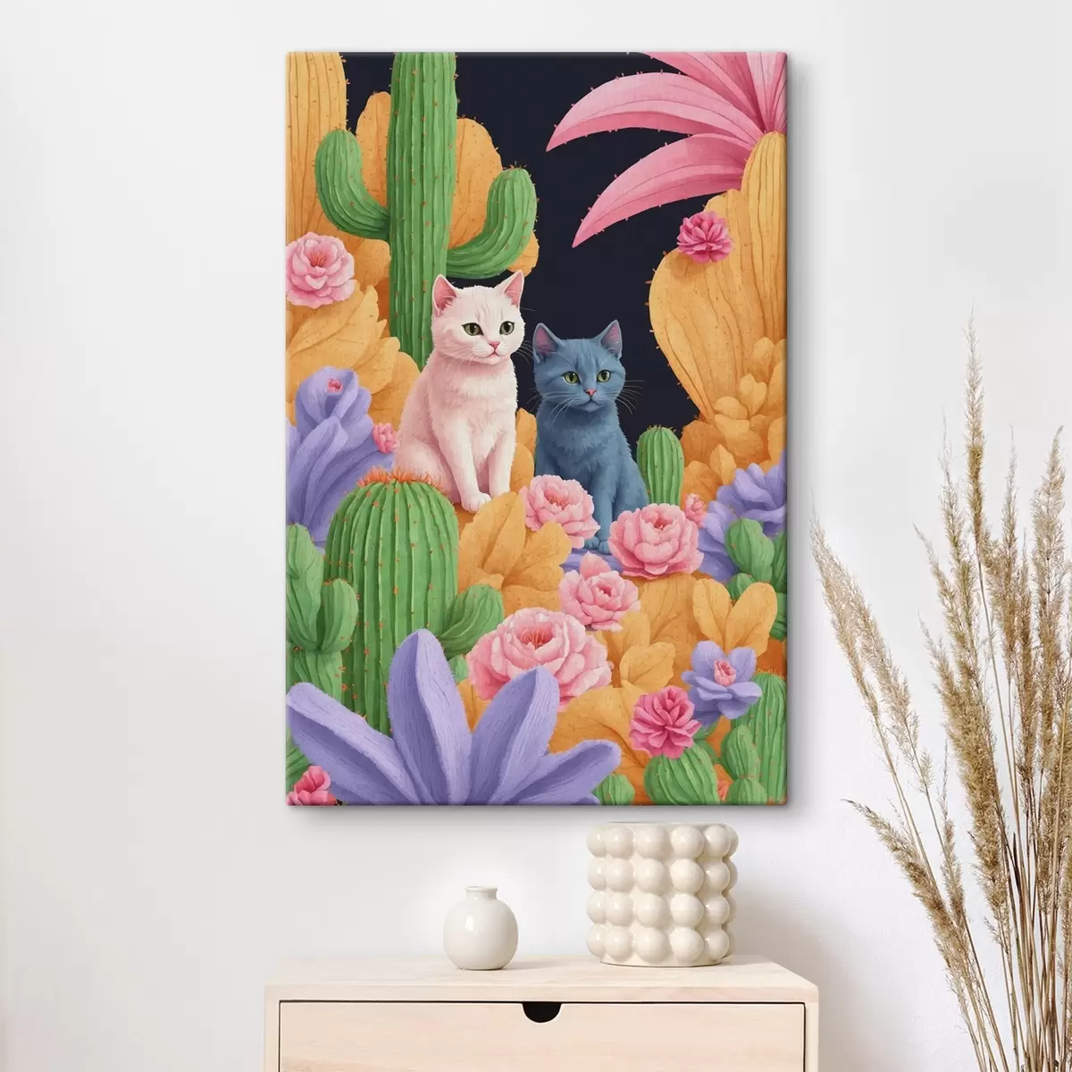 Paveikslas Dirbtinės katės tarp gėlių ir kaktusų Nr s44452