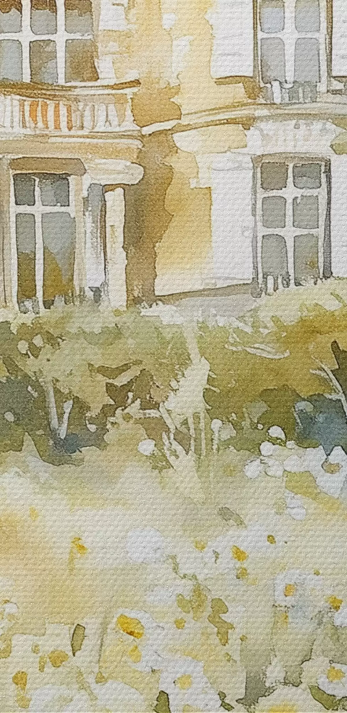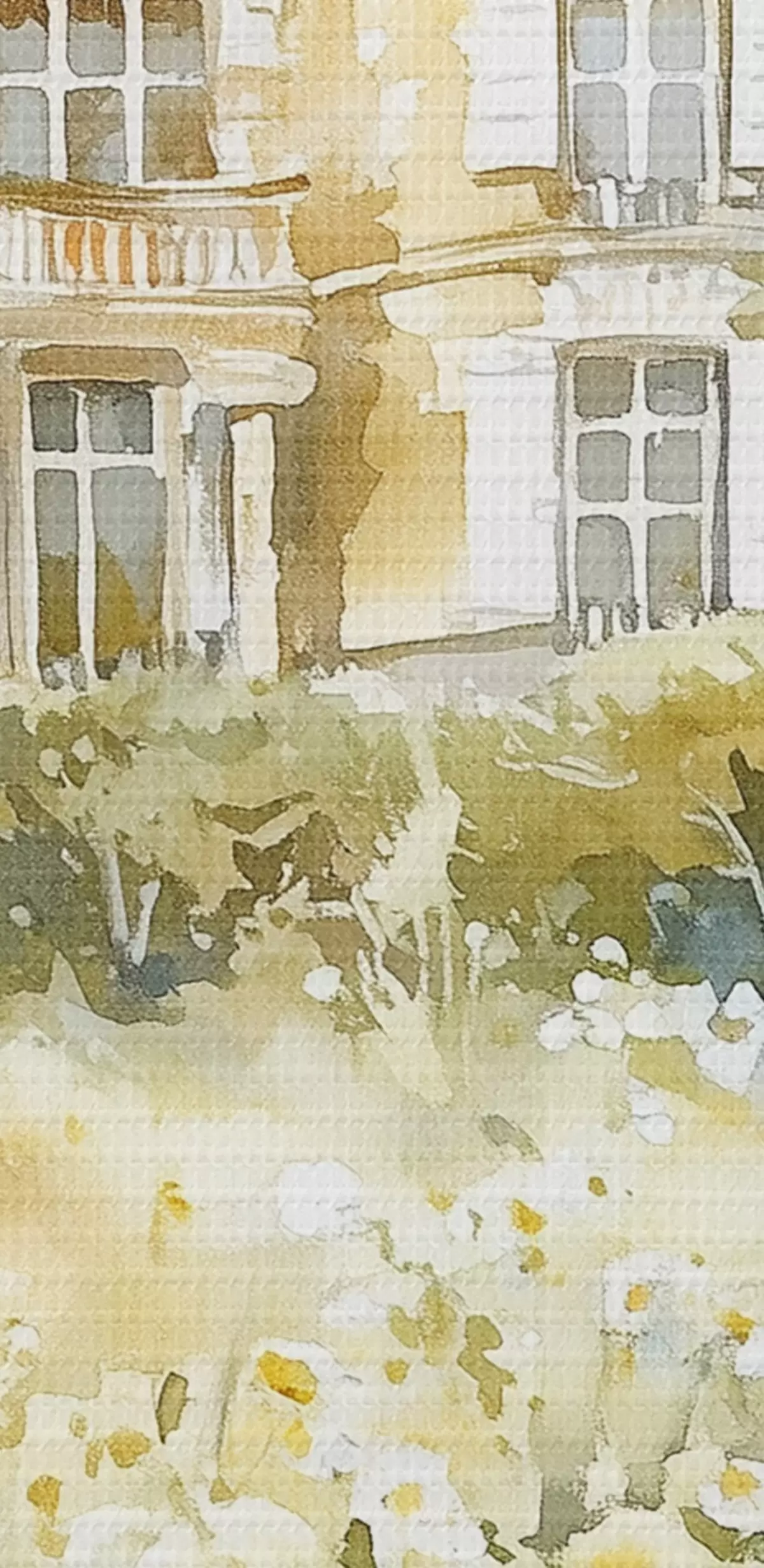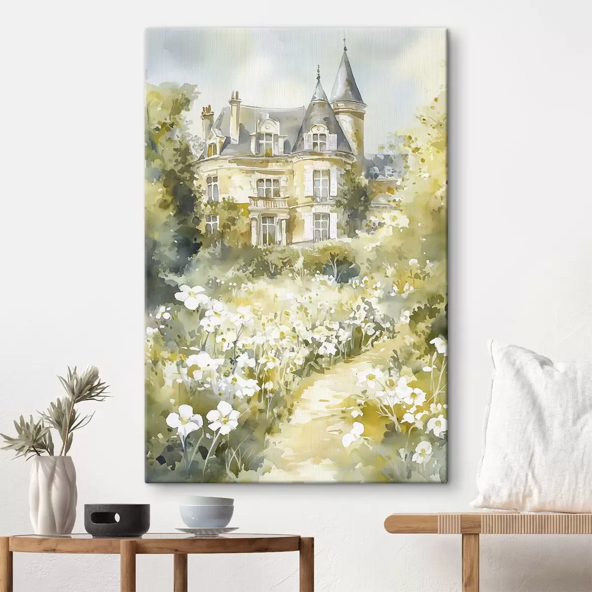 Paveikslas Gražus pilis su žaluma ir baltomis gėlėmis, akvarelės stilius Nr s44506
