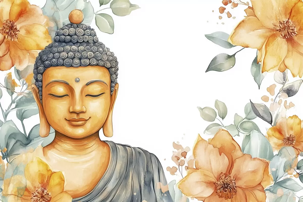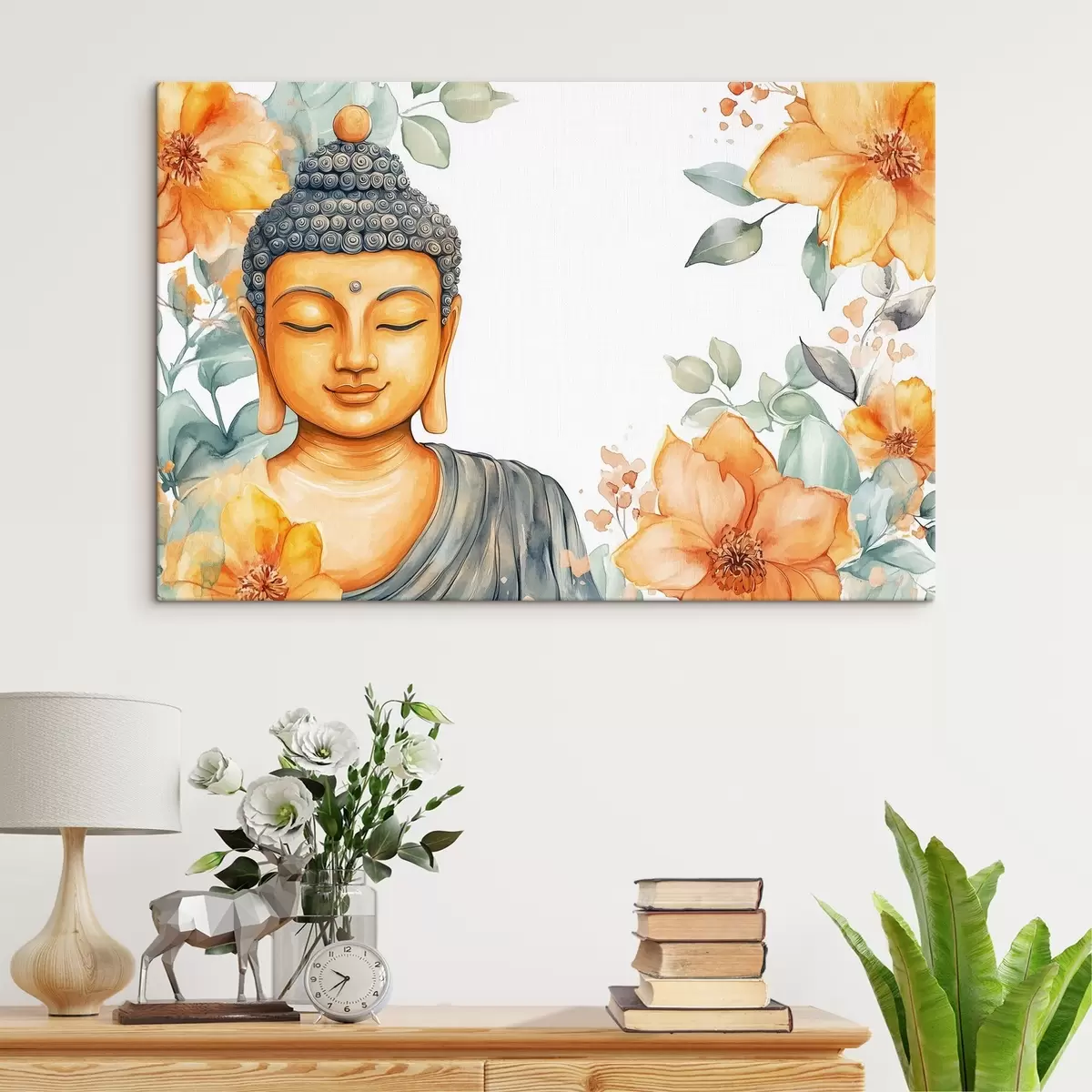 Paveikslas Buda oranžinių gėlių apsuptyje, akvarelės stilius Nr s44508
