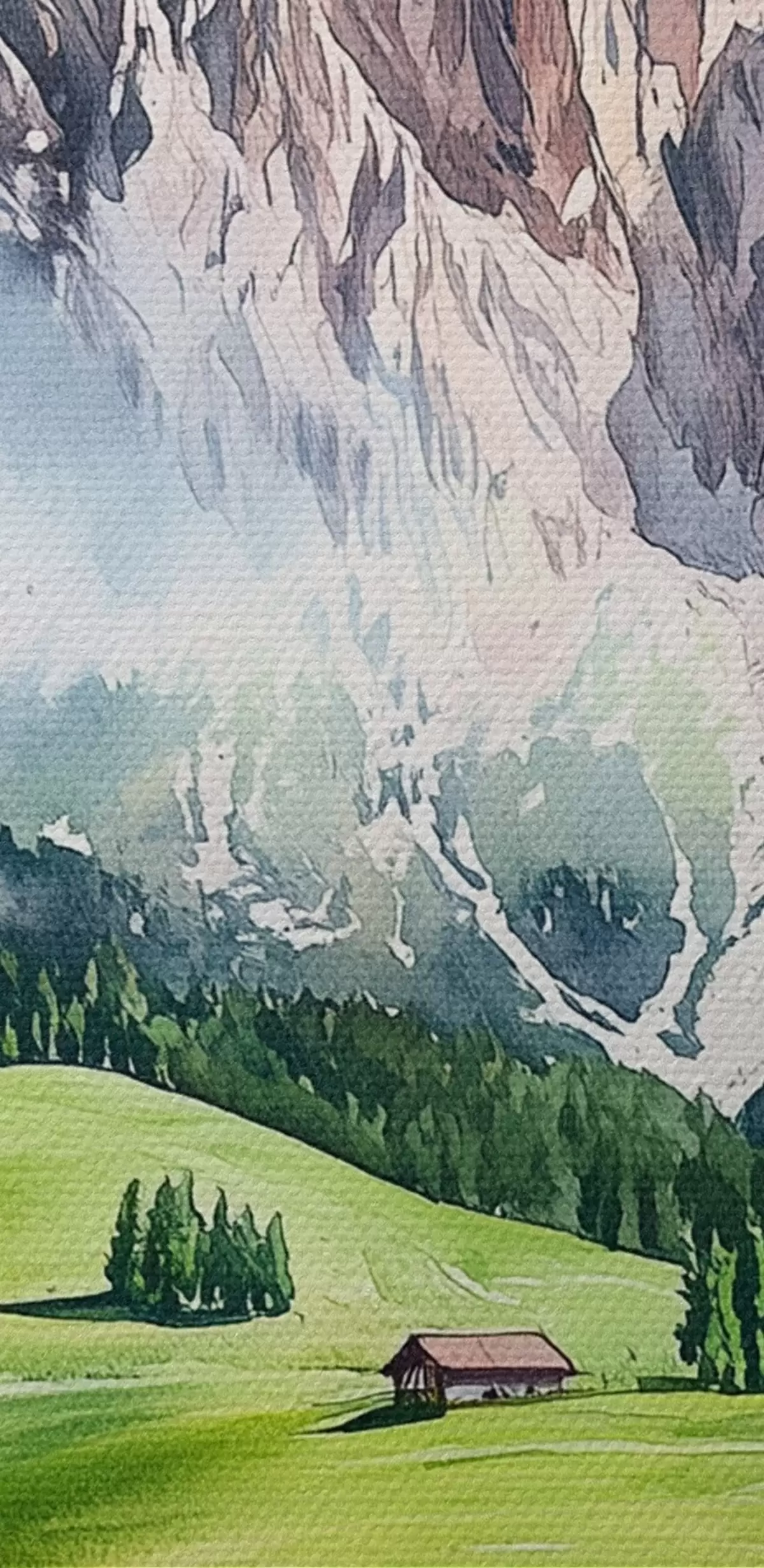 Paveikslas Dolomitai, Alpių kalnai, Italija, kraštovaizdis, akvarelės stilius Nr s44601