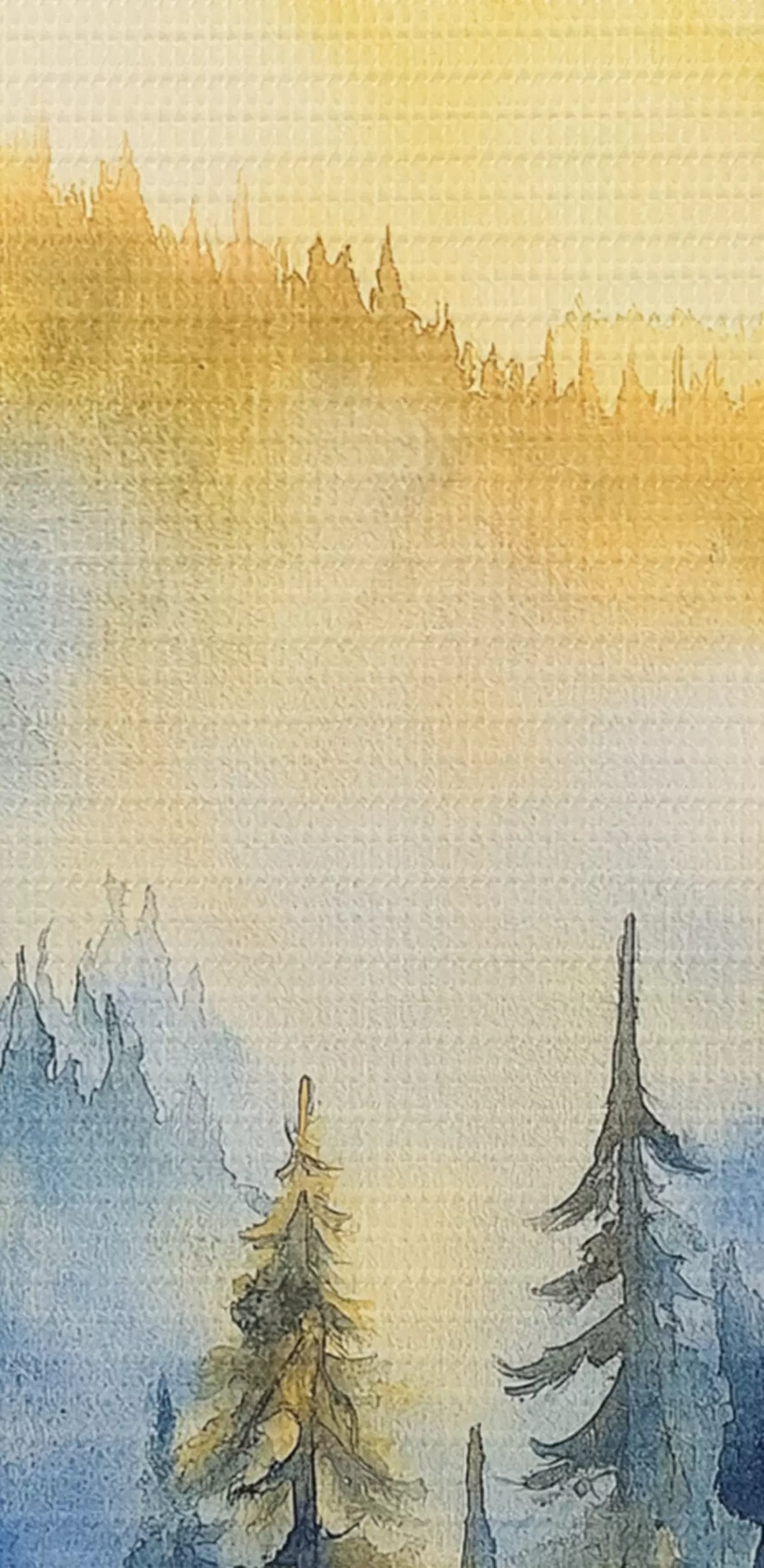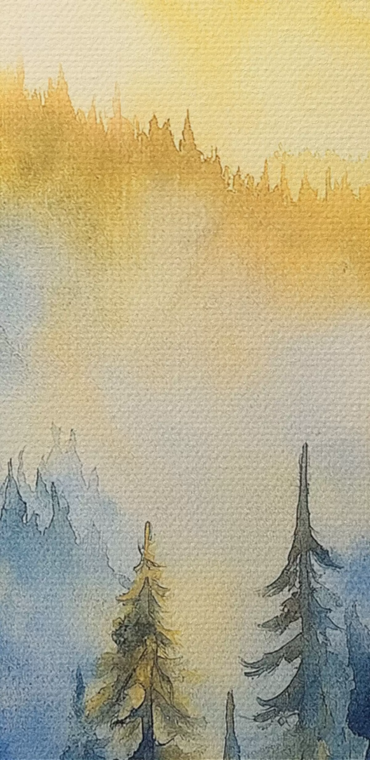 Paveikslas Miglotas kalnų saulėtekis, pušų fonas, mėlyna ir geltona spalvos Nr s44602