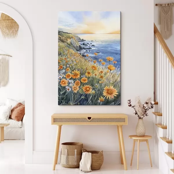 Paveikslas Uola su oranžinėmis gėlėmis, vandenyno pakrantė, Portugalija, akvarelės stilius Nr s44604
