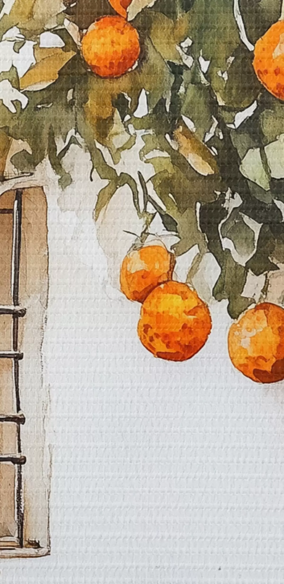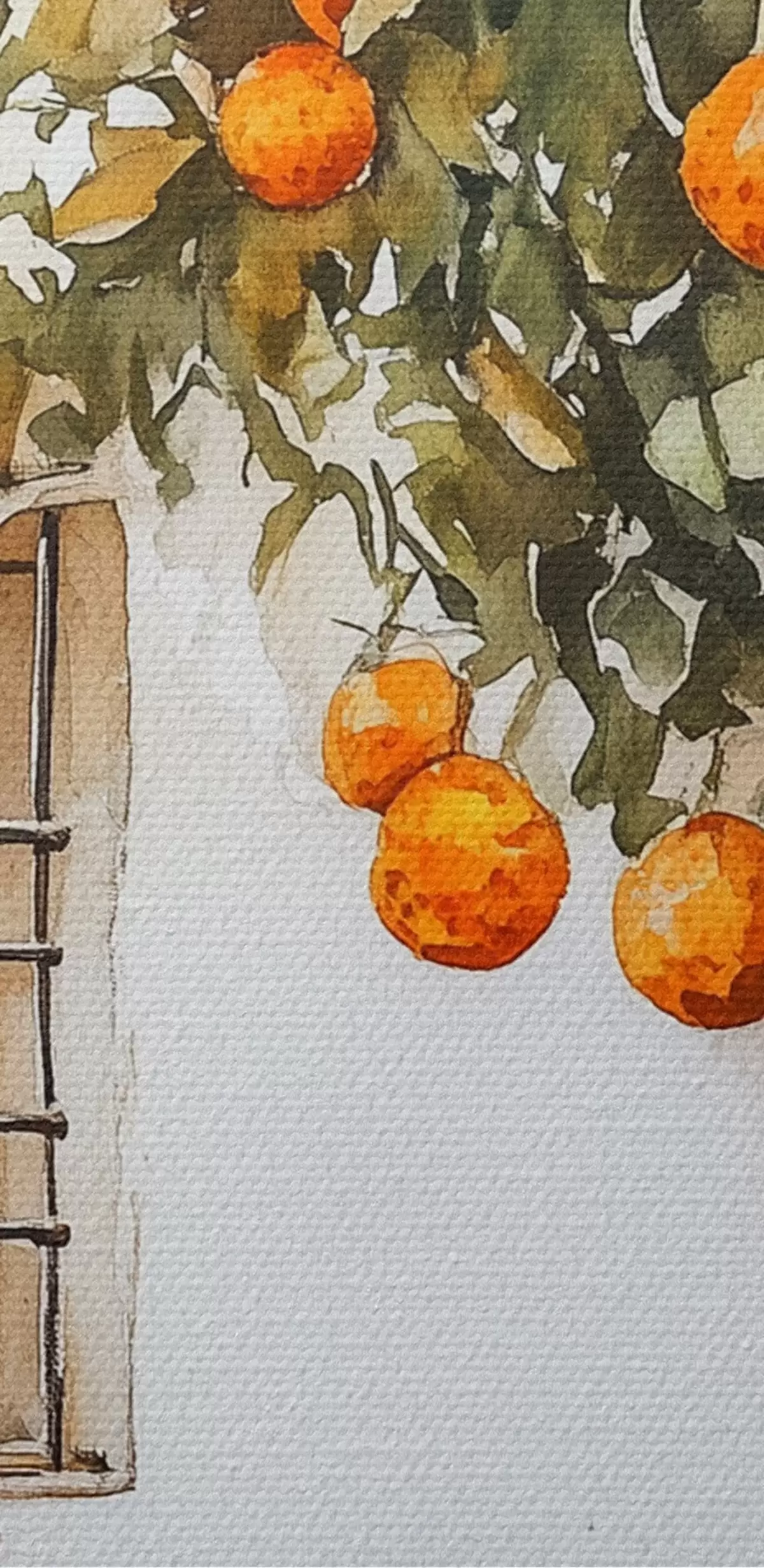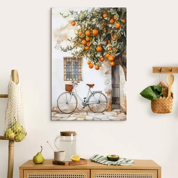 Paveikslas Viduržemio jūros regiono baltas namas su apelsinmedžiu ir dviračiu Nr s44610