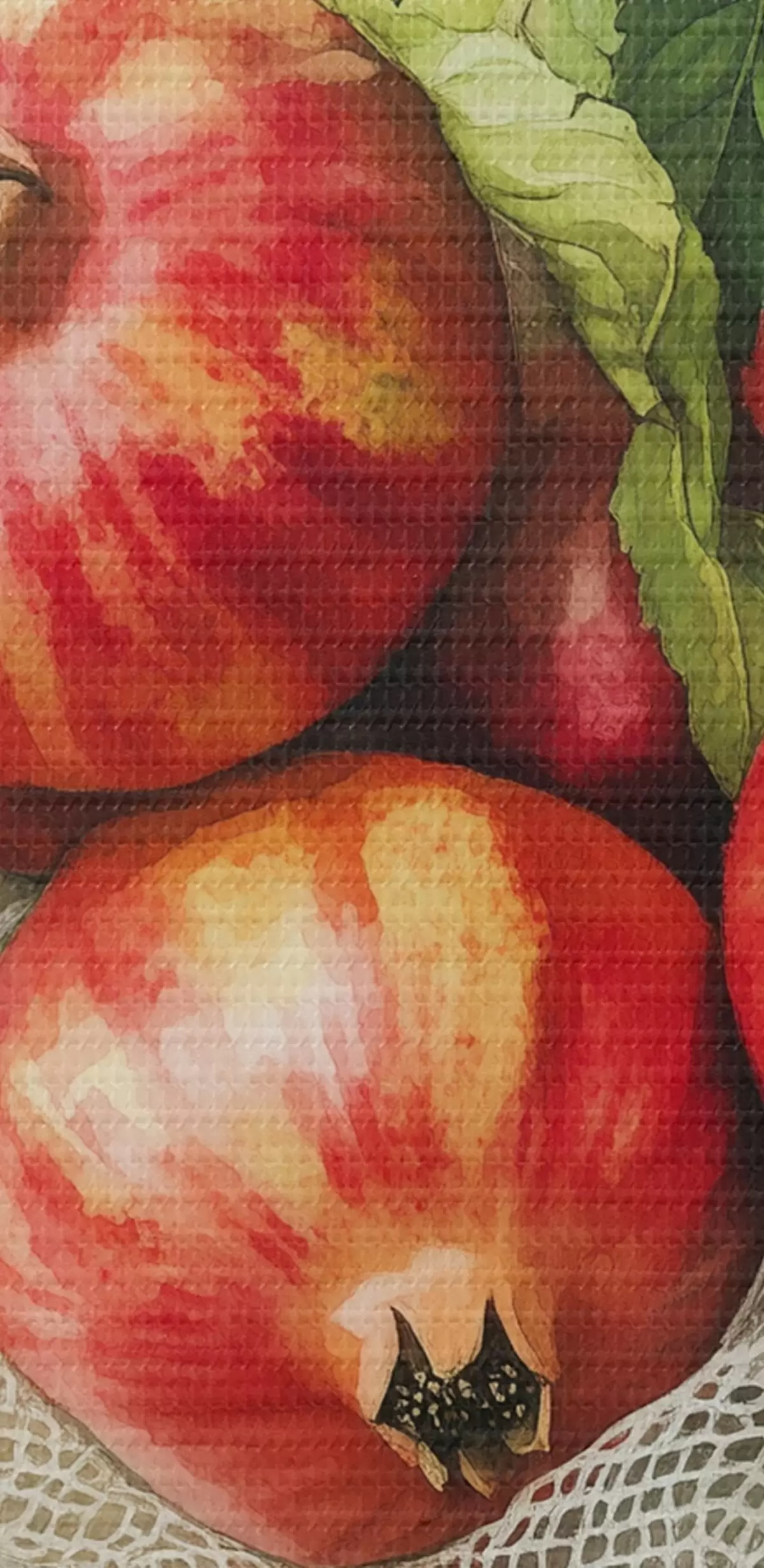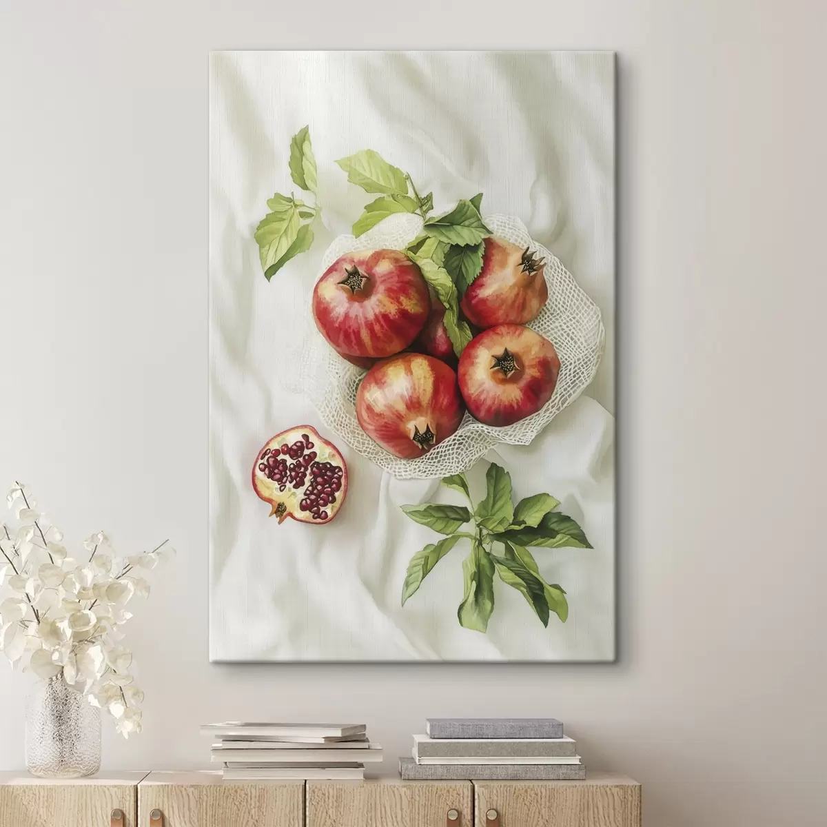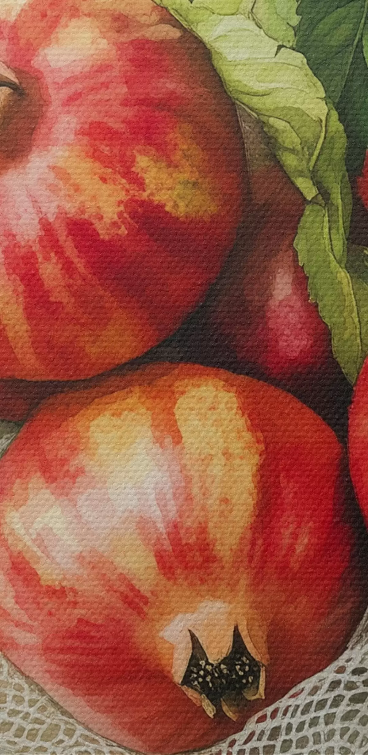 Paveikslas Granatai su mėtų lapeliais ant lininės staltiesės, kaimiškas stilius Nr s44611
