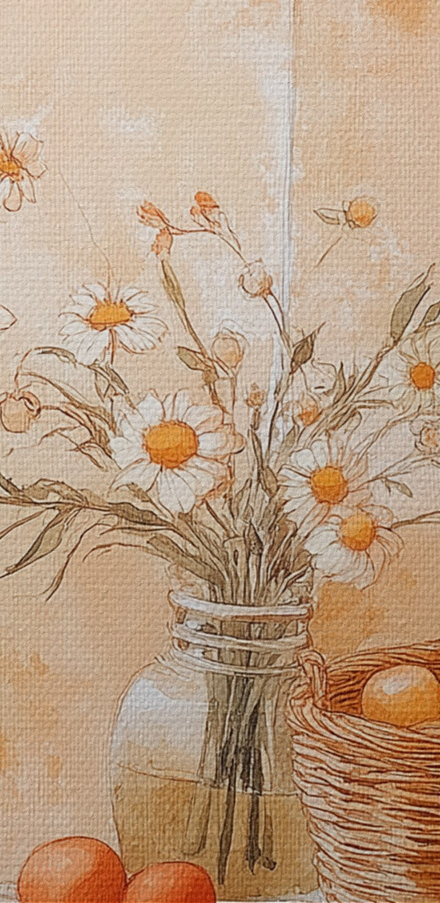 Paveikslas Arkinė siena su antikvariniu stiklainiu, ramunėlių gėlėmis ir apelsinų krepšeliu Nr s44613
